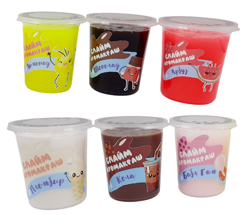 Слайм 200 мл "Аромакраш" в ассортименте 1/6 Кола/Лимонад/БаблГам/Шоколад/Арбуз/Пломбир Упаковка стакан, цвет слайма = цвету продукта + аромат продукта
