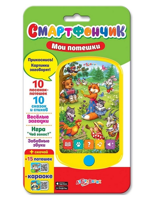 Новый смартфончик для самых маленьких! Нажимай – все картинки говорят! Пой и веселись с любимыми героями: лисичкой-сестричкой, козой-дерезой, мишкой косолапым и другими. 10 песенок-потешек, 10 сказок и стихов, весёлые загадки, игра «Чей голос?», забавные звуки и голоса – всё это ты найдешь в смартфончике «Мои потешки»! С такой игрушкой – не соскучишься! Бонус! Скачай бесплатно 15 интерактивных потешек на смартфон или планшет! QR-код для скачивания – внутри упаковки.