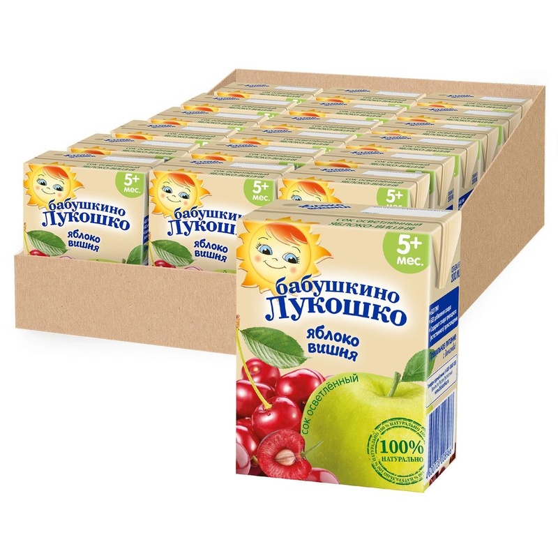 Нет в наличии ОтсутствуетСок Бабушкино Лукошко Яблоко-вишня осветленный с 5 мес. 200 мл (тетрапак). Сок яблочно-вишнёвый осветлённый восстановленный для питания детей раннего возраста Вкусный и полезный сок в удобной упаковке - возьмите с собой в дорогу, на прогулку, в гости. • - без сахара • - с 5 месяцев Состав продукта Яблочный сок, вишнёвый сок. Изготовлен из концентрированных соков. Без ГМО. Без добавления сахара. Содержит сахара природного (естественного) происхождения. Рекомендации по употреблению Сок рекомендуется употреблять, начиная с 0,5 чайной ложки в день, постепенно увеличивая до 100 мл в день. Упаковка Продукт объемом 200 мл стерилизован и асептически упакован в комбинированную упаковку. Пищевая ценность В 100 г продукта: углеводы - 11,0 г; минеральные вещества: калий - 70-300 мг, энергетическая ценность - 44 ккал/184 кДж. Срок хранения 12 месяцев с даты изготовления. Хранить при температуре от 0°С до +25°С и относительной влажности воздуха не более 75%. Открытый пакет хранить в холодильнике при температуре от +2°С до +6°С, не более 24 часов. Полезные свойства Яблочно-вишнёвый сок - источник фруктовых кислот, витаминов (С, А, фолиевая кислота), минеральных веществ (калий, кальций, железо), сахаров природного происхождения. Полезен в качестве средства укрепляющего иммунитет. Благотворно влияет на работу желудочно-кишечного тракта. Бренд Бабушкино лукошко Страна-производитель Россия
