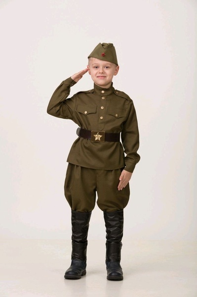 Карнавальный костюм Солдат Арт. 8011 Реалистичный военный образ времен Великой Отечественной войны будет отлично смотреться на праздниках 9 мая и 23 февраля. В комплект детского костюма Солдат входит гимнастерка, брюки, ремень и пилотка. Особенности: Гимнастерка свободного покроя с высоким воротником и погонами Пряжка ремня со звездой Брюки формы галифе Пилотка с красным значком Характеристики: Материал: текстиль Производитель: Батик Страна-изготовитель Россия.