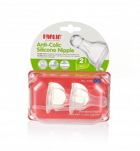 Farlin Эластичные силиконовые соски средний поток на стандартное горлышко 2 шт. имеют точечное среднее отверстие. Особенности: Подходят для негустого питания: молока и молочных смесей, чая, воды. Специальный воздушный клапан, который открывается и закрывается вместе с ритмом сосания малыша. Воздушный клапан делает поток питания равномерным, предотвращается заглатывание воздуха, что, в свою очередь, способствует предотвращению кишечных колик у ребенка. Стретч-эффект. Соска во время кормления растягивается и двигается так, что полностью имитирует сосок груди матери, даря малышу ощущение естественного вскармливания. Рекомендуемый возраст: 3+ месяцев.