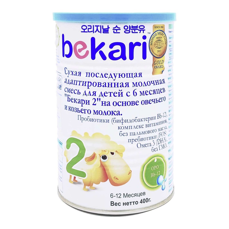 Сухая адаптированная молочная смесь на основе овечьего и козьего молока Бекари -2, с 6 мес. 400 гр. Первая в России смесь из двух видов молока - овечьего и козьего! Овечье и козье молоко с давних времён считалось особенно полезным. Его давали ослабленным взрослым и детям У этого молока уникальный и богатый минеральный и витаминный состав. Оно легко переваривается и усваивается нашими малютками, потому что размер гранул жира и белка в нём намного меньше чем у коровьего молока. “Bekari” содержит: - пребитики (пищевые волокна (FOS)), которые так же способствуют нормализации микрофлоры в животиках малышей - пробиотики (бифидобактерии Bb-12) от всемирно-известного бренда “CHR HANSEN“ (Дания), которые помогают обеспечить комфортное пищеварение - жиры с уникальной “OPO” структурой аналогичные жирам материнского молока и важные жирные кислоты Омега 3 (DHA) и Омега 6 (ARA). Употребление овечьего и козьего молока сразу после материнского снижает вероятность возникновения аллергии на белки коровьего молока. Белковый состав “Bekari” адаптирован в сторону легкоусвояемых белков (Ещё один плюс для активной жизни и спокойного сна). Смесь растительных масел (кукурузное, рапсовое, кокосовое, подсолнечное, соевое). Не содержит ГМО и пальмового масла. Витамин D , фосфор, кальций - обеспечивают рост и крепость зубов и костей В производстве используется уникальная “микрокапсульная” технология, обеспечивающая жизнеспособность пробиотиков. Состав:Деминирализованная овечья молочная сыворотка, Козье молоко, Смест растительных масел (кукурузное, рапсовое, кокосовое, подсолнечное, , соевое), 1,3-олеин2-пальмитат триглицерид (ОРО жиры), Фруктоолигосахариды (FOS), L - карнитин тартрат, Витамины: (Витмин А, Витамин D, Витамин Е, Витами К1, Витамин В1, Витамин В2, Витамин В6, Витамин В12, Витамин С), Ниацин, Фолиевая кислота, Пантотеновая кислота,Биотин, Холин, Инозитол, Минералы (Цитрат натрия, Иодид калия, Карбонат калия, Сульфат меди, Сульфат магния, Сульфат железа, Сульфат цинка, Сульфат марганца, Карбонат кальция, Трикальция фосфат, Хлорид калия), фосфолипиды, (Омега-3), Докозагексаеновая кислота, пробиотики (бифидобактерии Bb-12), Лютеин. Срок годности 24 месяца. Изготовитель Корея