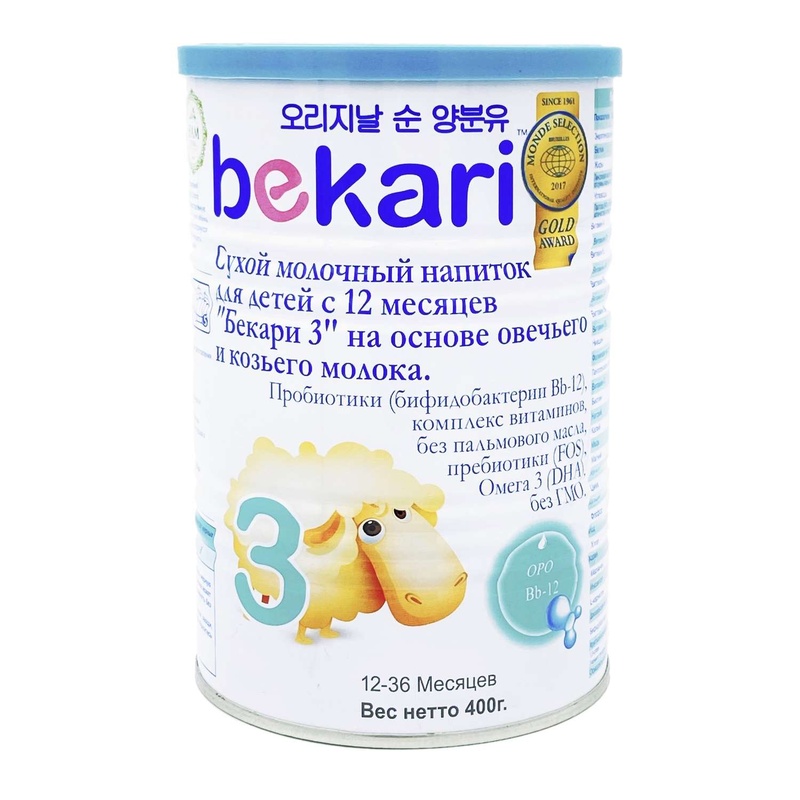 Сухая адаптированная молочная смесь на основе овечьего и козьего молока Бекари -3, с 12 мес. 400 гр Первая в России смесь из двух видов молока - овечьего и козьего! Овечье и козье молоко с давних времён считалось особенно полезным. Его давали ослабленным взрослым и детям У этого молока уникальный и богатый минеральный и витаминный состав. Оно легко переваривается и усваивается нашими малютками, потому что размер гранул жира и белка в нём намного меньше чем у коровьего молока. “Bekari” содержит: - пребитики (пищевые волокна (FOS)), которые так же способствуют нормализации микрофлоры в животиках малышей - пробиотики (бифидобактерии Bb-12) от всемирно-известного бренда “CHR HANSEN“ (Дания), которые помогают обеспечить комфортное пищеварение - жиры с уникальной “OPO” структурой аналогичные жирам материнского молока и важные жирные кислоты Омега 3 (DHA) и Омега 6 (ARA). Употребление овечьего и козьего молока сразу после материнского снижает вероятность возникновения аллергии на белки коровьего молока. Белковый состав “Bekari” адаптирован в сторону легкоусвояемых белков (Ещё один плюс для активной жизни и спокойного сна). Смесь растительных масел (кукурузное, рапсовое, кокосовое, подсолнечное, соевое). Не содержит ГМО и пальмового масла. Витамин D , фосфор, кальций - обеспечивают рост и крепость зубов и костей В производстве используется уникальная “микрокапсульная” технология, обеспечивающая жизнеспособность пробиотиков. Состав:Деминирализованная овечья молочная сыворотка, Козье молоко, Смест растительных масел (кукурузное, рапсовое, кокосовое, подсолнечное, , соевое), 1,3-олеин2-пальмитат триглицерид (ОРО жиры), Фруктоолигосахариды (FOS), L - карнитин тартрат, Витамины: (Витмин А, Витамин D, Витамин Е, Витами К1, Витамин В1, Витамин В2, Витамин В6, Витамин В12, Витамин С), Ниацин, Фолиевая кислота, Пантотеновая кислота,Биотин, Холин, Инозитол, Минералы (Цитрат натрия, Иодид калия, Карбонат калия, Сульфат меди, Сульфат магния, Сульфат железа, Сульфат цинка, Сульфат марганца, Карбонат кальция, Трикальция фосфат, Хлорид калия), фосфолипиды, (Омега-3), Докозагексаеновая кислота, пробиотики (бифидобактерии Bb-12), Лютеин. Срок годности 24 месяца. Изготовитель Корея