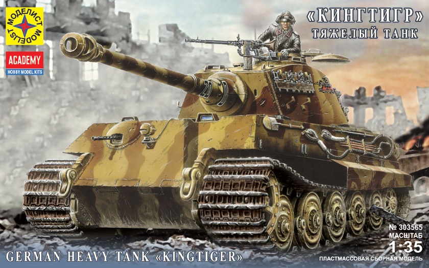 303565 техника и вооружение "Кингтигр" с двумя фигурами и металлическими деталями (1:35) Тяжелый танк «Кингтигр», Германия, 1944 год Уже в 1942 году Управление вооружений Вермахта разработало тактико-техническое задание на тяжелый танк, который должен был в перспективе заменить недавно запущенный в производство Pz.Kpfw.VI «Тiger». На новой машине предполагалось использовать сконструированную в 1941 году фирмой Krupp новую 88-мм пушку. Создавая новый тяжелый танк, конструкторы фирмы «Хеншель» не изобрели ничего оригинального: взамен корпуса старого «Тигра» в основу проекта были положены формы и пропорции корпуса и башни «Пантеры». Новый танк получил обозначение Panzerkampfwagen VI Ausf.B (Sd.Kfz.182), позже замененное на Panzerkampfwagen-Tiger Ausf.B или Tiger II. Неофициальное название «Konigstiger» («Королевский тигр») в Вермахте использовалось редко, наиболее популярным оно было у англо-американских союзников, называвших танк «Kingtiger». В России это название прижилось как «Кингтигр». Серийное производство «Королевскиих Тигров» началось в январе 1944-го. На первых пятидесяти машинах устанавливали башню разработки компании «Порше». Начиная с 51-й машины ввели новую башню фирмы «Хеншель». Она отличалась от башни «Порше» более простой конфигурацией, расположением люков на крыше, полным отсутствием каких-либо отверстий в бортах. Управлением вооружений предполагалось изготовить 1237 танков, однако из-за участившихся ударов авиации союзников по сборочным заводам «Хеншель» эти планы реализовать не удалось. Первый бой «Кингтигров» состоялся 18 июля 1944 года в Нормандии, где 503-му тяжёлому танковому батальону удалось подбить 12 танков «Шерман». А уже 12 августа танк появился на Восточном фронте: 501-й тяжелый танковый батальон пытался помешать проведению Львовско-Сандомирской наступательной операции. Однако, как и в случае с «Тиграми I» под Ленинградом в 1942 году, и здесь начало оказалось неудачным. За трое суток непрерывных боёв с 11 по 13 августа 1944 года войсками 6-го Гвардейского танкового корпуса было захвачено и уничтожено 24 вражеских танка, 12 из которых являлись новыми тяжёлыми танками «Кингтигр». Последние 13 выпущенных «Королевских тигров», забранных прямо с завода, получили третьи роты 510-го и 511-го (бывшего 502-го) батальонов. С 1 апреля они вели бои в районе Касселя. В целом, новая машина оказалась не слишком удачной, прежде всего из-за низкой маневренности, ненадежной трансмиссии и ряда других технических просчетов, но почему-то считается лучшим танком фашистской Германии.