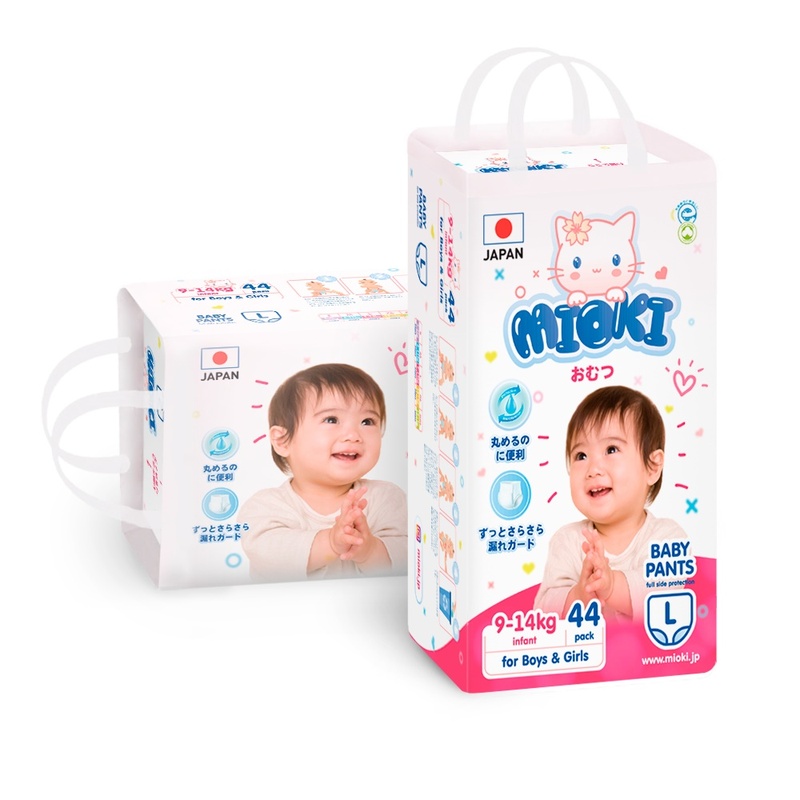 Подгузники-трусики MIOKI разработаны в Японии, выпускаются в 4 размерах для малышей от 6 до 15+ кг Впитывающий слой подгузников-трусиков MIOKI состоит из super absorbent polymeric – полимеров c высокой впитываемостью. Каждая гранула удерживает в 300 раз больше жидкости чем весит сама. Благодаря технологии SAP подгузники: НЕ ПРОТЕКАЮТ НЕ ПАХНУТ НЕ ВЫЗЫВАЮТ ВЫСЫПАНИЙ И ОПРЕЛОСТЕЙ Высокая талия -Для удобной посадки Широкий эластичный пояс - Для плотного прилегания. не сдавливая животик. Двойные складкивокруг ножек - Для защиты от протеканий Мягкие швы - Для свободы движений - Специальным образом обработанные края не натирают кожу. Внутренний слой из 100% хлопка - Для сухости кожи с пропиткой из масла алоэ вера Индикатор наполнения подгузника - Для маминого удобства, он подскажет, когда подгузник следует поменять. Лента утилизации - Для быстрого сворачивания использованного подгузника Абсорбирующий материал - Для равномерного распределения жидкости, не мешающего малышу двигаться, не топорщится и не собирается комками