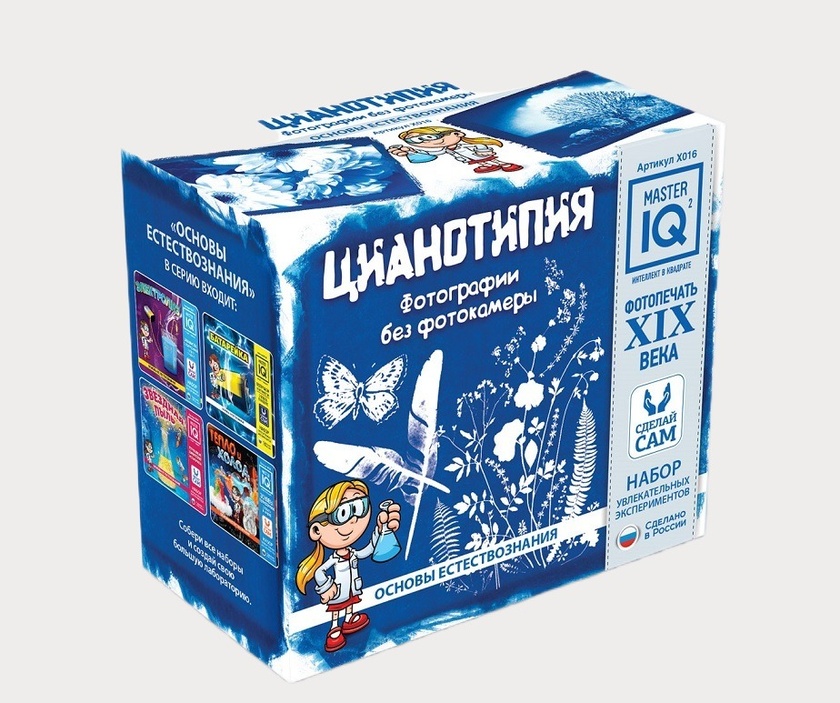 Нет в наличии ОтсутствуетИзначально цианотипия помогала ученым копировать чертежи и рукописи, а ботаникам создавать фотограммы растений, фотографы делали с ее помощью тестовые отпечатки. Технология цианотипии изобретена еще в 19 веке, но при этом она очень проста и доступна для понимания даже самым маленьким исследователям. Набор «Цианотипия» содержит все необходимые вещества, чтобы провести интереснейший опыт и узнать больше об одном из разделов физической химии — фотохимии. В результате эксперимента вы получите отпечатки синих и голубых оттенков с помощью совершенно безвредных для человека химических реактивов и ультрафиолета из солнечного света! Сейчас цианотипия — самый распространенный среди фотографов альтернативный фотопроцесс, постепенно его берут на вооружение дизайнеры по тканям, декораторы. Вы сможете привить ребенку стремление к прекрасному и украсить свой дом, самостоятельно напечатав фотографию или фотограммы из подручных материалов, просто ознакомившись с инструкцией к набору.