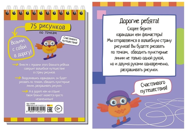 Открыв этот блокнот, ребёнок попадёт в волшебную страну рисунков. Вооружившись карандашом, он будет рисовать по точкам, обводить пунктирные линии не только одной рукой, но и двумя руками одновременно, раскрашивать рисунки. В дороге или на отдыхе такой блокнот окажется просто незаменим. Адресовано детям от 5 лет.