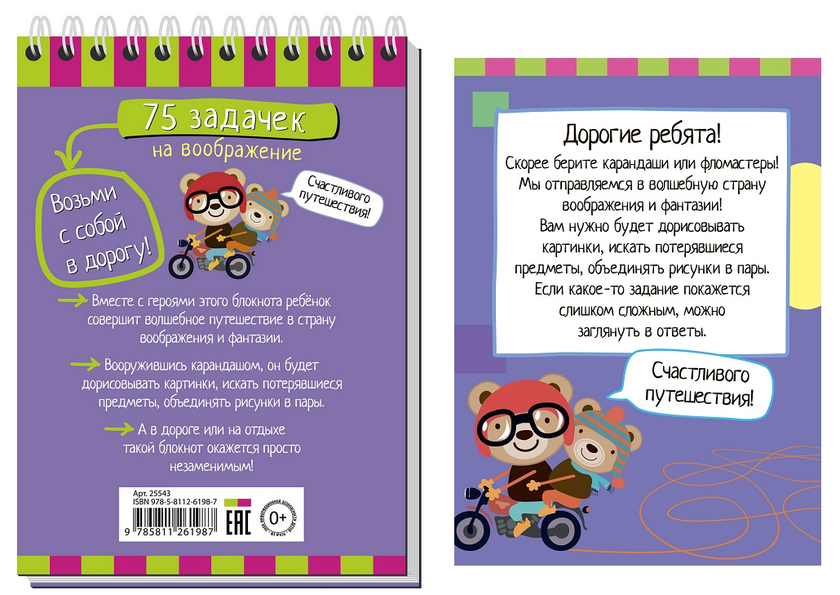 Открыв этот блокнот, ребёнок попадёт в волшебную страну воображения и фантазии. Вооружившись карандашом, он будет дорисовывать картинки, искать потерявшиеся предметы, объединять рисунки в пары. А в дороге или на отдыхе такой блокнот будет просто незаменим. Адресовано детям от 5 лет.