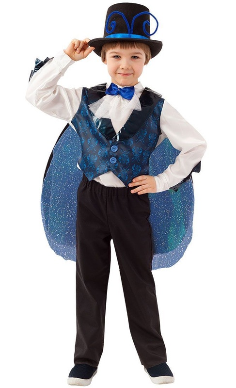 Особенности: Белая рубашка с длинными рукавами и жабо Синий бант на воротнике и фигурные нашивки на рукавах Синий жилет с принтом в виде жуков и застежкой на пуговицы Большие двухслойные крылья пришиты к спинке жилета Брюки прямые на резинке Цилиндр черный с синей лентой и усиками Характеристики: Материал: сатин Размеры: 26 - 32 Рост: 104 - 128 см Производитель: Пуговка