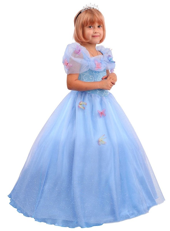 Особенности: Лиф и рукава выполнены из объемной воздушной ткани с бабочками Узор на корсете Длинная пышная юбка с верхней блестящей тканью, украшенной бабочками Серебристая диадема Характеристики: Материал: сатин Размеры: 28 - 34 Рост: 110 - 134 см Производитель: Пуговка