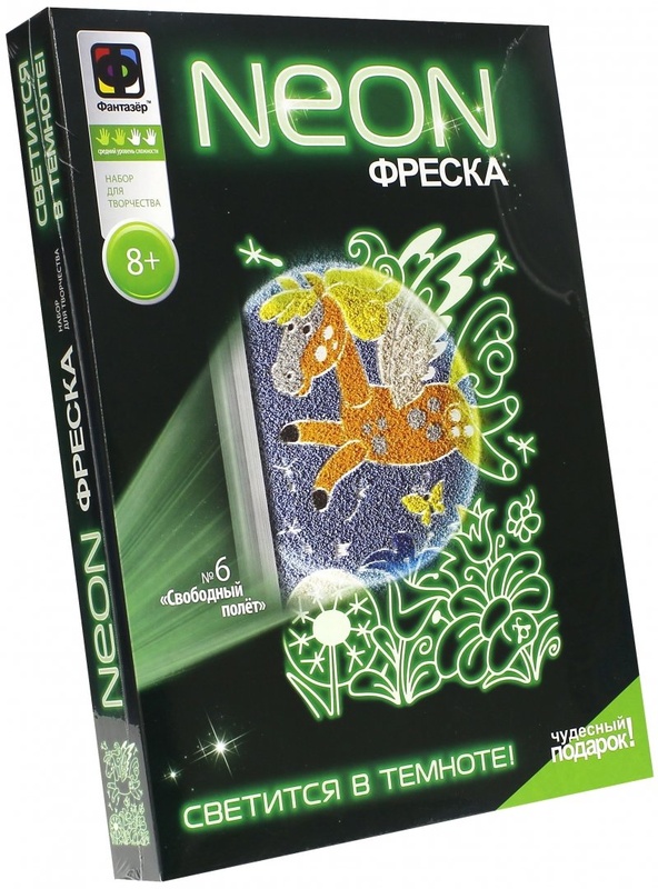 Возраст: от 8 лет Для мальчиков и девочек Комплект: основа с высечным трафаретом, набор цветного песка, люминофор, заготовка рамки, деревянный стик, кисточка, салфетка. Из чего сделана игрушка (состав): кварц, люминофор, дерево, бумага, картон, пленка, пластик. Размер упаковки: 23 х 4 х 31 см. Упаковка: картонная коробка. Страна обладатель бренда: Россия. Набор для творчества "Свободный полет" от компании "Фантазер" представляет собой фреску с нанесенным трафаретом. С помощью специального песка контурную картинку фантастического животного можно сделать более яркой. Выключив свет в комнате, можно увидеть неоновое свечение, которое создает невероятный световой эффект.