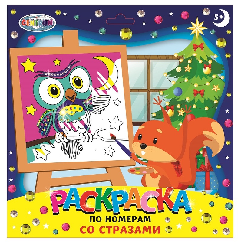 90958 Картинка по номерам со стразами Сова Зимняя серия, гуашь 6 цветов, стразы, кисточка