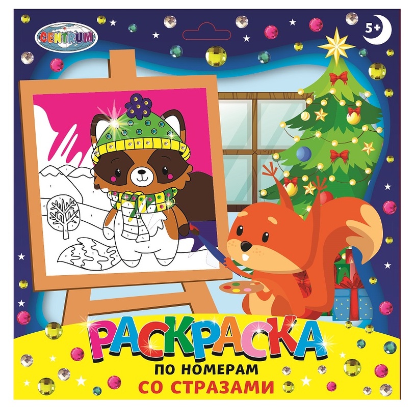 90960 Картинка по номерам со стразами Енот Зимняя серия, гуашь 6 цветов, стразы, кисточка