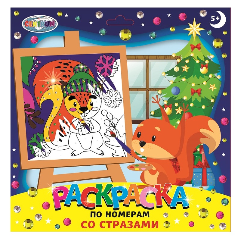90961 Картинка по номерам со стразами Белочка Зимняя серия, гуашь 6 цветов, стразы, кисточка