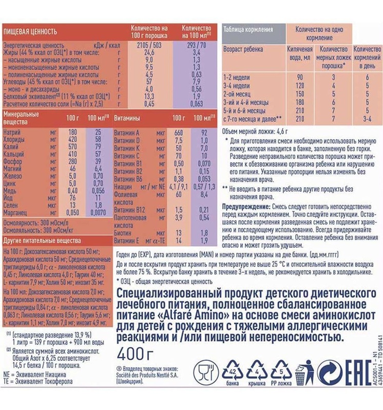 Нет в наличии ОтсутствуетМолочная смесь Nestle Alfare Amino с рождения 400 г. Alfare Amino представляет собой неаллергенную аминокислотную смесь для эффективного облегчения симптомов, связанных с осложненными (тяжелыми) случаями аллергии на белок коровьего молока (АБКМ) и непереносимости пищевых продуктов. Смесь также может использоваться как дополнительный вариант диетического лечения детей, не достигающих улучшения при применении высокогидролизованных смесей. Смесь Alfare Amino, в состав которой входит запатентованный комплекс липидов, предназначена для улучшения переносимости и степени всасывания в наиболее проблематичных ситуациях. Смесь имеет нейтральный вкус, благодаря чему хорошо принимается детьми и может использоваться с самого рождения. Всегда советуйтесь с медицинским работником, прежде чем вносить какие-либо изменения в рацион ребенка. Смесь может использоваться как элиминационная диета (исключается ряд продуктов) для диагностики следующих состояний: аллергия к белкам коровьего молока; поливалентная пищевая аллергия, ее проявления: атопический дерматит, проблемы с желудочно-кишечным трактом (упорные срыгивания, рвота, жидкий стул, кровь в стуле), аллергический насморк, приступы удушья. Продукт работает в наиболее сложных случаях. Клинически доказанное эффективное и безопасное решение. Особенности: 25% от жирового компонента составляют СЦТ для лучшего усвоения. DHA и ARA в соотношении 1:1, аналогично грудному молоку. Низкая осмолярность 194 мОсм/л. Структурированные жиры (4,5% бета-пальмитата). Условия хранения: хранить в сухом месте при температуре не выше 25°С и относительной влажности воздуха не более 75%. Приготовление: прежде чем приступить к приготовлению детской смеси, вымойте руки. Тщательно вымойте бутылочку, соску и крышку, чтобы на них не осталось следов молока. Прокипятите их в течение 5 минут. Накройте до использования. Прокипятите питьевую воду в течение 5 минут и затем остудите до 40°С. Руководствуясь таблицей кормления, налейте в прокипяченную бутылочку точно отмеренное количество воды. Руководствуясь таблицей кормления, добавьте точное количество мерных ложек порошка в соответствии с возрастом ребенка. Взболтайте бутылочку до полного растворения порошка. После приготовления смеси банку с порошком следует плотно закрыть. Полный состав продукта: кукурузный сироп, растительные масла (подсолнечное масло с высоким содержанием олеиновой кислоты, масло канола, подсолнечное масло, пальмовый олеин), аминокислоты (L-аргинин, L-аспартат, L-лизина ацетат, L-лейцин, L-пролин, L-глутамин, L-валин, глицин, L-изолейцин-треонин, L-серин, L-фенилаланин, L-тирозин, L-гистидин, L-аланин, L-цистин, L-триптофан магния, L-аспартат, L-метионон), среднецепочечные триглицериды, картофельный крахмал, минеральные вещества (кальция глицерофосфат, калия хлорид, кальция цитрат, натрия цитрат, калия цитрат, натрия фосфат, магния оксид, железа сульфат, цинка сульфат, меди сульфат, калия йодид, марганца сульфат, натрия селенат), эмульгатор (У472с), докозагексаеновая кислота (DHA), арахидоновая кислота (ARA), витамины (С, Е, ниацин, пантотеновая кислота, В2, А, В1, В6, фолиевая кислота, D3, К1, В12, биотин), холина битартрат, регулятор кислотности (Е330), таурин, мио-инозитол, карнитин. Важно! Смесь следует готовить непосредственно перед каждым кормлением. Точно следуйте инструкц
