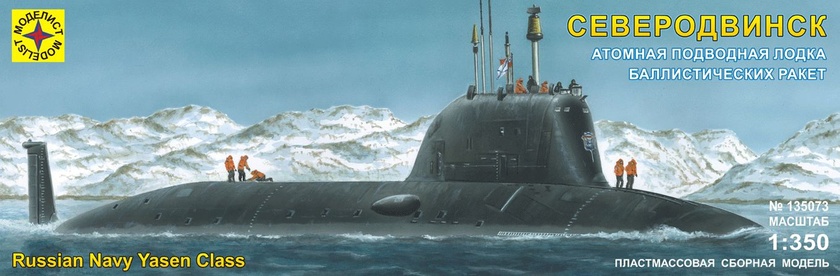 135073 флот Атомная подводная лодка крылатых ракет "Северодвинск" (1:350) «Северодвинск» - атомная подводная лодка крылатых ракет, Россия, 2010 г. Создание облика атомной подводной лодки четвёртого поколения началось ещё в 1977 году. Одной из особенностей советского и российского подводного флота являлось использование десятков различных типов и модификаций субмарин, что значительно затрудняло их эксплуатацию и судоремонт. На смену сразу нескольким типам лодок: ПЛАТ (подводные лодки атомные торпедные), МПЛАТРК (многоцелевые подводные лодки атомные торпедные с крылатыми ракетами, противоавианосные ПЛАРК (подводные лодки атомные с крылатыми ракетами) планировалось создать единую многоцелевую лодку, способную решать максимально широкий круг задач.Согласно планам модернизации Российского подводного флота, атомные подводные крейсеры проекта 885 «Ясень» станут одним из четырёх типов подводных лодок, принятых на вооружение. Проектировщиком нового типа субмарин стало Санкт-Петербургское морское бюро машиностроения «Малахит», уже имевшее опыт создания проектов многоцелевых подводных лодок. Главным конструктором стал Владимир Пялов. Проект 885 «Ясень» разрабатывался на базе проектов 705(К) «Лира» и 971 «Щука-Б» и был призван заменить как их, так и проект 949А «Антей». В проекте использованы многие технические решения, ранее не применявшиеся в отечественном подводном судостроении. Это, а также трудности с финансированием отечественного судостроения в девяностые годы, стало причиной столь длительной задержки со строительством нового типа подводных лодок. Закладка головного корабля класса «Ясень», получившего имя «Северодвинск», состоялась 21 декабря1993 года на «Севмаше», и только 15 июня2010 года он был спущен на воду.12 сентября2011 года атомная подводная лодка К-329 «Северодвинск» впервые вышла в море находовые испытания. Возможность комбинировать ракетное вооружение дает гибкость в выполнении широкого набора боевых задач — от поражения стационарных наземных целей ракетами «ЗМ-14» до борьбы с субмаринами противника и уничтожения всех типов надводных кораблей противокорабельными ракетами «ЗМ-54» и П-800«Оникс». Находясь в акватории Белого моря, атомная подводная лодка "Северодвинск" осуществила из подводного положения несколько подряд успешных пусковновейшей морской сверхзвуковой крылатой ракеты в рамках испытаний штатного ракетного комплекса "Калибр". 24 июля2009 года на Севмаше состоялась закладка второго корабля этого класса по усовершенствованному проекту 885М «Ясень-М», которому присвоено имя «Казань». Начато строительство однотипного подводного крейсера – «Уфа». Госпрограмма вооружений России на 2011—2020 годы предусматривает постройку десяти атомных подводных лодок проекта 885 «Ясень».