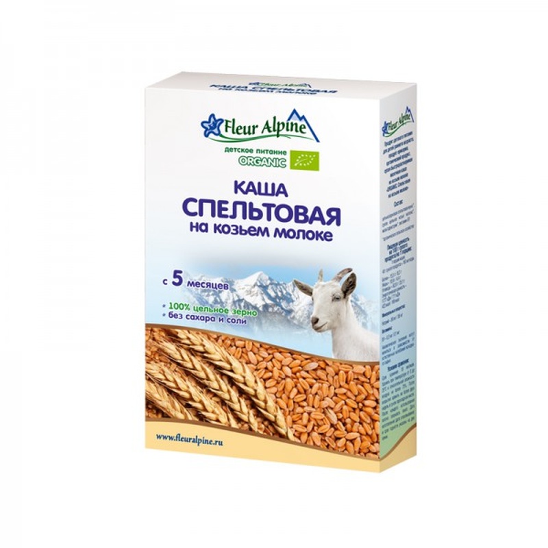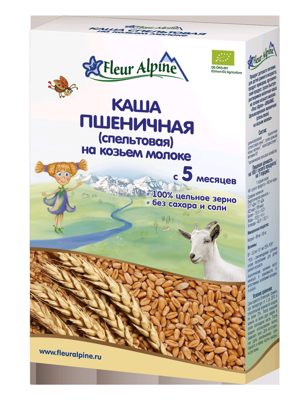 Нет в наличии ОтсутствуетКаша Fleur Alpine Organic (Флер Альпин Органик) пшеничная (спельтовая) на козьем молоке с 5 мес. 200 г Натуральная каша из органической цельнозерновой пшеницы подходит для питания малышей с 5 месяцев. Богатая витаминами, минералами и питательными веществами каша изготовлена из спельты - древнего сорта пшеницы, который никогда не подвергался селекции и сохранил свои первозданные полезные свойства. Спельтовая каша содержит больше белка, насыщенных жирных кислот, микроэлементов и клетчатки, чем обычная пшеничная каша. Она хорошо усваивается, а также имеет нежную консистенцию и приятный вкус. Изготовленная из продуктов органического земледелия, каша не содержит сахара и соли. Состав: цельнозерновая спельтовая мука*, сухое цельное козье молоко*, мальтодекстрин*, витамин В1 (* - органическое сельское хозяйство). · Не содержит сахара, соли. · Содержит сухое козье молоко и витамин В1. · Сертифицирована в соответствии с законодательством Европейского союза и имеет соответствующую маркировку на упаковке. · Пищевая ценность на 100 г: белки - 15,5 г, углеводы - 62,8 г, жиры - 10,9 г, витамин B1 - 0,3 мг, натрий - 89 мг. · Энергетическая ценность на 100 г: 422 ккал. · Масса: 200 г. · Производство: Германия · Бренд · Fleur Alpine