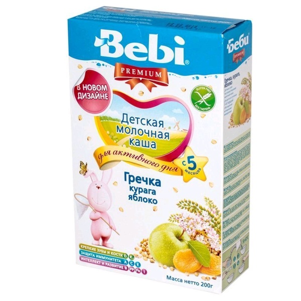 Bebi Молочная Гречневая каша Premium с курагой и яблоком с 5 мес. 200 г Бренд: Bebi (Словения), Возраст: с 5 мес Гречневая молочная каша Premium с курагой и яблоком - это каша высшего качества, относящиеся к категории продуктов экстра-класса. Приготовлены из 100% натуральных, тщательно отобранных ингредиентов. Они имеют тонкий вкус и нежную консистенцию. Bebi Premium - это оптимальное сочетание 12 витаминов и минералов, а также дополнительное обогащение железом и йодом, что так необходимо для правильного роста и развития малыша. Гречневая крупа имеет высокуюпищевую ценность благодаря содержанию легкоусвояемого белка. Гречка является безглютеновой культурой. Каша содержит специально обработанное высококачественное натуральное коровье молоко и богата биологически активными растительными жирами. Фрукты - это поставщик важнейших микроэлементов (калий, магний, натрий и т.д.), пищевых волокон, антиоксидантов. Яблоки характеризуются низкой калорийностью, содержат много клетчатки, которая вызывает чувство насыщения, богаты витаминами и минералами. Курага имеет диетические и целебные свойства. В частности, она содержит большое количество калия, минеральных веществ и витаминов. Кроме того, курага благотворно влияет на нервную систему, пищеварение, способствует выведению из организма вредных веществ, полезна для работы сердечно-сосудистой системы. Каша обогащена железом, йодом и важнейшими витаминами (A, C, E, D, В1, В2, РР). Железо участвует в процессах кроветворения и переноса кислорода к клеткам и тканям организма, а йод важен для умственного развития и роста детей. Каша отличается пониженным содержанием сахара. Состав: гречка 43%, цельное сухое молоко 33%, сахароза, сгущенный яблочный сок 5,8%, пюре из кураги 4% (сахароза, мякоть кураги), витамины (ретинола ацетат, холекальциферол, токоферола ацетат, тиамина гидрохлорид, рибофлавин, пиридоксина гидрохлорид, аскорбиновая кислота, кальция пантотенат, фолиевая кислота, никотинамид, фитоменадион, цианокобаламин) и минеральные вещества (дифосфат железа, йодид калия). Характеристики: Обогащена важнейшими витаминами и минералами Не содержит вкусовых добавок, ароматизаторов, консервантов, красителей, генетически модифицированных продуктов Благодаря специальной технологической обработке снижается риск возможной аллергии Растворимая без варки Объем 8-12 порций Энергетическая ценность: 426 ккал