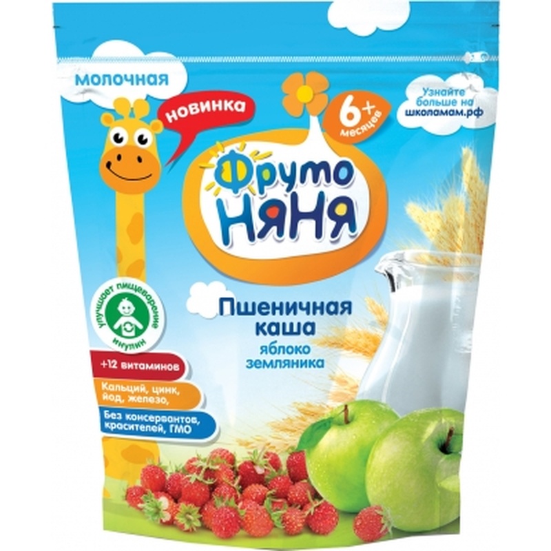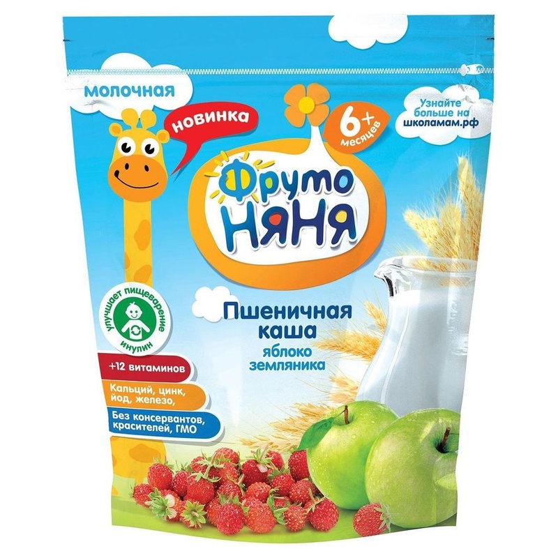 ФрутоНяня каша пшеничная с яблоками и земляникой молочная быстрорастворимая, обогащённая пребиотиками, витаминами и минеральными веществами, для питания детей раннего возраста. Рекомендации по употреблению: рекомендуется детям с 6 месяцев. Начинайте вводить кашу постепенно с 1 чайной ложки готового продукта. Рекомендуемое количество порций каши – 1-2 в день. Для кормления используйте только свежеприготовленную кашу. Оставшаяся после кормления порция не подлежит использованию. Рекомендуемый суточный объем готовой каши к 6 месяцам составляет 150 г в сутки, к 8 месяцам - 180 г, к 12 месяцам - 200 г. Допускается приготовление каши с использованием грудного молока, искусственной смеси, цельного, обезжиренного или частично разбавленного молока. При приготовлении каши необходимо строго соблюдать инструкции, указанные на упаковке. Дополнительные характеристики Особенности: не содержит консервантов, не содержит красителей, не содержит ГМО Условия хранения: при температуре до +25°с, с относительной влажностью воздуха не более 75%. Не подвергать воздействию прямого солнечного света. Срок годности: 12 месяцев. Срок годности после открытия: 20 дней в сухом прохладном месте (но не в холодильнике). После каждого использования упаковку тщательно закрывать. Состав Молочные продукты: обезжиренное сухое молоко, сливки сухие Ягоды: земляничное пюре Зерновые: пшеничная мука Концентраты: концентрированное яблочное пюре Минералы: железо, цинк, йод, натрий, кальций Пищевые добавки: сахар, инулин Витамины: витамин C, витамин E, витамин А, витамин D3, витамин PP, витамин B1, витамин B2, витамин B5, витамин B6, витамин B7, витамин B9, витамин B12 Бренд: ФрутоНяня Страна-производитель: Россия Вес упаковки: 0.2 кг.