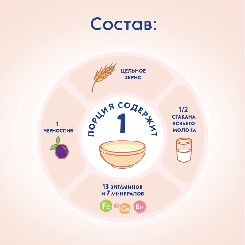 Овсяная каша МАМАКÓ с черносливом на козьем молоке. Овсяная каша МАМАКÓ с черносливом для детей старше 6 месяцев — уникальная рецептура для улучшения работы кишечника. 100% натуральные продукты Обогащена комплексом витаминов и минералов Высокая доля козьего молока в составе каши (32%) Не содержит коровьего молока Без крахмала Без растительных масел Без консервантов, красителей и ароматизаторов Без ГМО Полезные свойства: Нежная консистенция овсянки и чернослив оказывают мягкое стимулирующее действие, а козье молоко увеличивает количество полезных бифидо- и лактобактерий в кишечнике. Природное разнообразие макро- и микронутриентов, содержащихся в овсе (калий, кальций, магний, фосфор, железо, медь, йод, цинк и кремний), делают его незаменимым злаком для полноценного роста и развития малыша. Натуральный чернослив в сочетании с козьим молоком придает каше мягкий сливочный вкус, превращая ее в полезное лакомство. Все каши МАМАКÓ обогащены 13 витаминами и 7 минералами, включая комплекс Ca-Fe-I для профилактики рахита, железодефицитной анемии и йододефицита, которые по данным Союза педиатров России наблюдаются у 30–60 % детей раннего возраста. В каждой каше МАМАКÓ содержится 32 % козьего молока, которое за счет своих структурных свойств увеличивает биодоступность кальция и железа на 20%. Состав: овсяные хлопья (измельченные), козье молоко (32%), чернослив, фруктоза, комплекс минералов (карбонат кальция, пирофосфат железа, йодид калия, сульфат цинка), комплекс витаминов (A, D, E, K, C, B1, B2, B6, B12, ниацин, фолиевая кислота, пантотеновая кислота, биотин), лимонная кислота. Страна-производитель Сербия и Черногория Габариты упаковки 20см x 13см x 5см Вес упаковки 0,2 кг