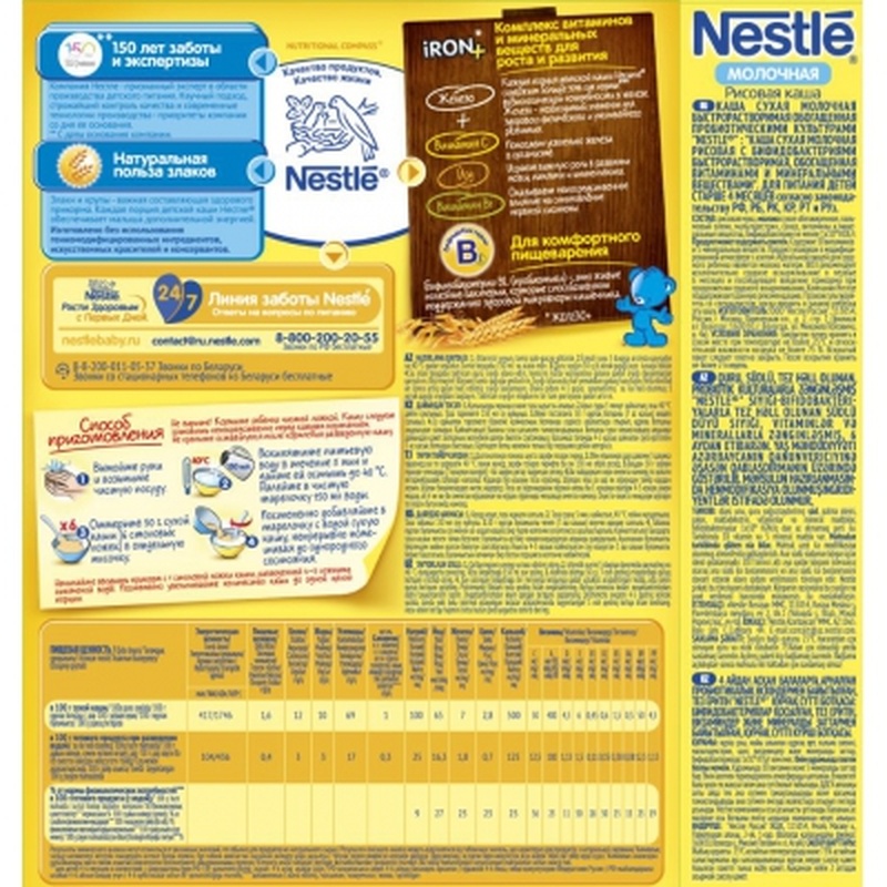 Нет в наличии ОтсутствуетКаша молочная Nestle рисовая с 4 мес. 220 г. Для детей с 4 месяцев. Молочная рисовая каша приготовлена с использованием особой технологии бережного расщепления злаков СНЕ. Благодаря этому в продукте появляется естественный сладкий вкус, каша лучше усваивается и имеет повышенную пищевую ценность. Каша является полезным сбалансированным прикормом для здоровых детей. Обогащена пробиотиками - живыми бифидобактериями BL. Они способствуют нормализации пищеварения, росту здоровой микрофлоры и укреплению иммунитета, что очень важно в период введения прикорма. Каша содержит комплекс витаминов и минеральных веществ iRON+ для здорового роста и развития. Особенности: · 10 витаминов и 5 минеральных веществ. · Комплекс витаминов и минеральных веществ iRON+. · С пробиотиками. · Не содержит ГМО, искусственные консерванты, красители и ароматизаторы. Способ употребления: начинайте вводить прикорм с 1 столовой ложки каши, разведенной с 4-5 столовыми ложками кипяченой воды. Постепенно увеличивайте количество каши до одной целой порции. Кормите ребенка ложкой. Не варить! Кашу следует готовить непосредственно перед каждым кормлением. Следуйте инструкции на упаковке. Не храните оставшуюся после кормления разведенную кашу. Условия хранения: после приготовления каши вскрытый пакет следует плотно закрыть. После вскрытия упаковки хранить не более 2 недель. Невскрытую упаковку следует хранить в сухом месте при температуре от 10°С до 25°С и относительной влажности воздуха не более 75%. · Состав: рисовая мука, молоко сухое обезжиренное, пальмовый олеин, мальтодекстрин, сахар, витамины и минеральные вещества, бифидобактерии не менее 1х10⁶ КОЕ/г · Пищевая ценность (на 100 г)белки 12 г, углеводы 69 г, жиры 10 г, пищевые волокна 1,6 г, энергетическая ценность 417 ккал / 1746 кДж · Срок годности от даты изготовления15 месяцев Торговая марка Nestle