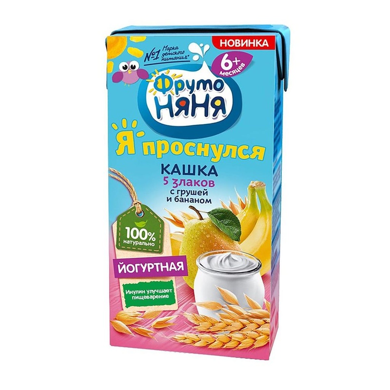 Кашка молочная ФрутоНяня йогуртная 5злаков-груша-банан 0.2 л с 6 месяцев Кашка молочная «йогуртная» из пяти злаков с грушей и бананом, готовая к употреблению, стерилизованная, обогащенная пребиотиками, с фруктозой для питания детей раннего возраста Гомогенизированная Продукт готов к употреблению. Рекомендации по употреблению: для питания детей старше 6 месяцев. Продукт готов к употреблению. Перед употребление взбалтывать Вскрытая упаковка с продуктом хранению не подлежит. Условия хранения: хранить до 14 суток, при температуре от + 0 С до + 258 С и относительной влажности воздуха не более 75%. Беречь от солнечных лучей. Срок годности после открытия: вскрытая упаковка с продуктом хранению не подлежит. Состав: Молочные продукты: молоко сухое цельное, фруктоза, пюре банановое,йогурт сухой обезжиренный, мука овсяная, мальтодекстрин, мука рисовая, молоко сухое обезжиренное, пребиотик-инулин, мука кукурузная, мука овсяная, мука гречневая, пюрегрушевое, натуральный ароматизатор «Банан», натуральный ароматизатор «Груша», вода. Пищевые добавки: инулин Продукт без заменителя молочного жира. Страна-производитель Россия Бренд ФрутоНяня
