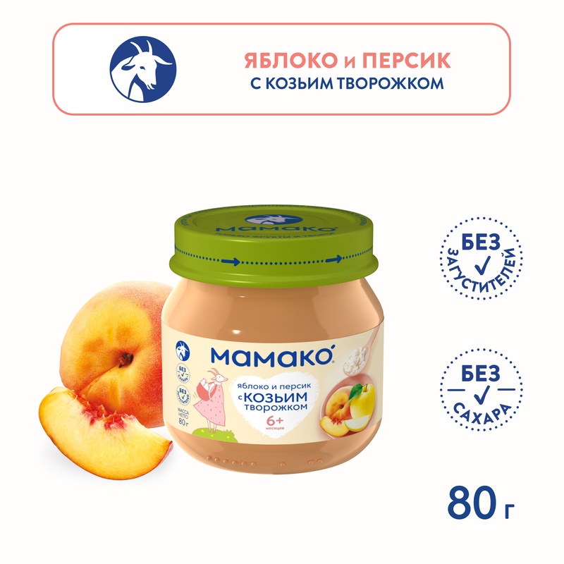 Пюре МАМАКО® из фруктов с козьим творожком – это вкусный, питательный и полезный прикорм малыша! В составе только фрукты и детский козий творожок – идеально для полдника! Нежный фруктово-сливочный вкус пюре МАМАКО® нравится даже «малоежкам». Пюре МАМАКО® из фруктов с козьим творожком - это новый любимый десерт крохи! 100% натуральный состав 20% детского козьего творожка Источник легко усвояемого белка и кальция Нежный, фруктово-сливочный вкус Пюре МАМАКО® "Яблоко с персиком и козьим творожком" – вкусная традиция здорового питания с раннего детства! Пюре МАМАКО® содержит 20% детского козьего творожка и обеспечивает не менее 1/3 суточной потребности ребенка в твороге. Детский козий творожок легко и комфортно переваривается в животике малыша, является источником кальция, фосфора и незаменимых аминокислот, важных для роста малыша. Яблоко и персик богаты витаминами и минералами. Бета-каротин персика укрепляет иммунитет малыша, а высокое содержание калия положительно влияет на познавательную активность, улучшает память. Пюре МАМАКО® из яблок с персиком и козьим творожком - это 2 в 1: полезный прикорм и любимое лакомство малыша! Состав: Пюре из яблок, пюре из персиков, творог из свежего козьего молока, вода питьевая. Пищевая ценность продукта: На 100 г продукта (среднее значение): белки - 1,5 г, жиры - 0,8 г, углеводы - 15,4 г. Энергетическая ценность / калорийность на 100 г продукта: 73,5 ккал / 307,7 кДж. Без глютена Без сахара Без консервантов, красителей и ароматизаторов Без ГМО Без соли Без загустителей