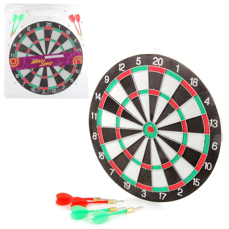 Нет в наличии ОтсутствуетДартс - веселая и увлекательная игра. В нее можно играть как в одиночку, так и целой компанией. Помимо того, что дартс хорошо тренирует координацию и последовательность движений, он расслабляет мышцы, снимает стресс, учит концентрации внимания. В комплект входят мишень, 4 дротика. Мишень можно повесить на стену - на задней стороне мишени имеется петелька. Повесьте мишень на стену, отойдите на приличное расстояние, прицельтесь, киньте дротик или шарик, стараясь попасть в центр мишени. Можно играть, суммируя очки, можно играть, считая количество попаданий в центр. Игрушка отлично тренирует меткость, ловкость, сноровку и глазомер. Игрушка изготовлена из высококачественного и безопасного полимерного материала, есть тканевые элементы, упакована в блистер с отверстием. Размеры мишени: 30*1*30 см. Размеры дротика: 3*3*10 см. Размеры игрушки в упаковке: 33*1,5*37 см.