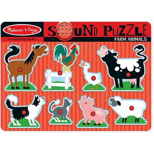 Пазл со звуком "Ферма", 8 деталей, Melissa & Doug (Мелисса и Даг) – это уникальный познавательный пазл для вашего малыша Пазл со звуком "Ферма" - это яркий, красивый пазл со звуковыми эффектами. На деревянной доске расположены симпатичные обитатели фермы: овечка, лошадь, утка, корова, собака, котенок, свинья и петух. В центре каждой картинки есть пластиковая ручка, за которую элемент пазла удобно держать и вставлять в подходящее для него место. Когда малыш правильно вставляет животное, раздается реалистичный звук его голоса! Собирая пазл, ребенок развивает мелкую моторику и логическое мышление, знакомится с разными видами животных и их голосами