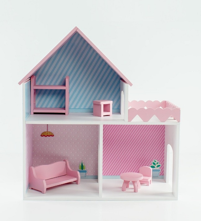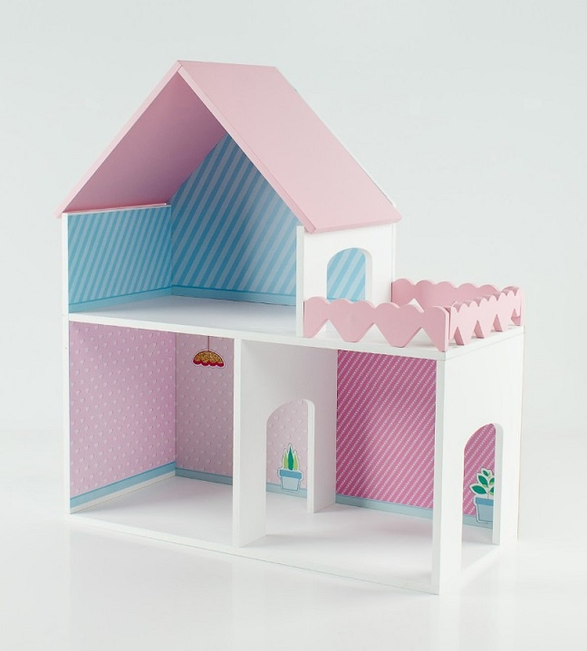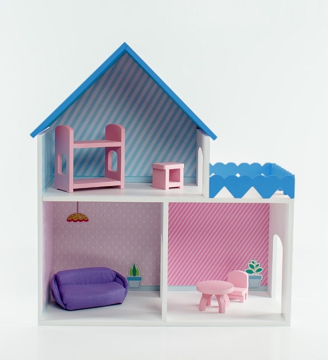 Дом "Пломбир" с интерьером Особенности: Деревянный дом для кукол до 15 см. С цветным интерьером (полноцветная УФ печать). 2 этажа, 3 комнаты, терраса. Основной цвет белый. Цветные элементы: крыша и забор террасы. (Возможность выбора палитры:синий, малиновый, розовый) Размеры: 45x50x20 см