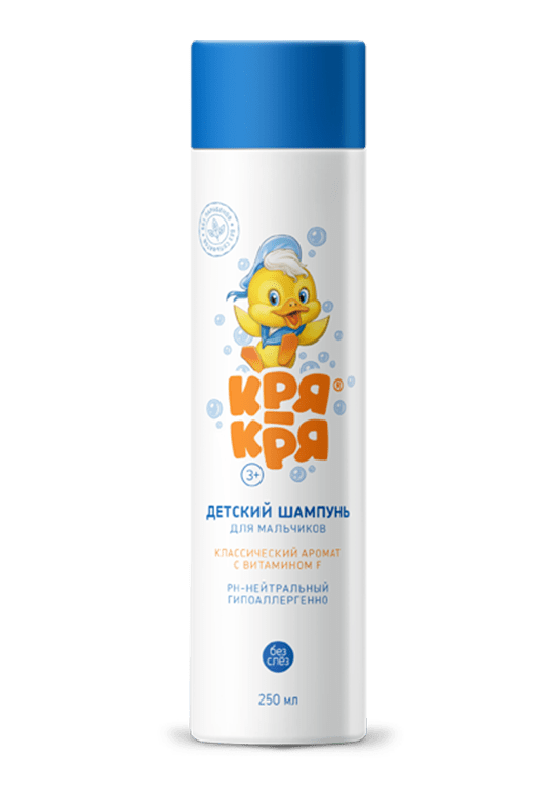 Кря-кря Детский шампунь для мальчиков, с витамином F, 250 мл Детский шампунь для мальчиков «КРЯ-КРЯ» бережно очищает и обволакивает волосы натуральными маслами, что делает их мягкими и послушными. Входящий в состав витамин F увлажняет кожу головы и корни волос, благодаря чему волосы растут здоровыми и сильными. Ромашка обладает смягчающим действием, снимает раздражение, снижает вероятность появления аллергических реакций, придаёт блеск волосам. Алоэ-вера оказывает успокаивающее действие на кожу головы. Мягко очищает, питает, увлажняет, ускоряет процесс заживления мелких ссадин. Шампунь не содержит сульфатов, парабенов и красителей. Волосы будут долго благоухать приятным ароматом, который очень нравится детям. Не щиплет глазки. Особенности: Содержит в составе витамин F, не сушит кожу. Натуральные компоненты и витамины бережно ухаживают за волосами и кожей головы. Подходит для ежедневного использования. Соответствует физиологическому уровню pH. Гипоаллергенно. Клинически подтверждено. Подходит для детей с 3 лет. Имеет приятный классический аромат. Кря-Кря – болгарский бренд детской косметики, который после долгого отсутствия на российском рынке, наконец, вернулся. Продукция разработана по современным технологиям с учетом высокои? чувствительности кожи ребенка. В составе новои? продукции «Кря-Кря» – натуральные компоненты, растительные экстракты, витамины и масла, при этом не содержатся сульфаты, парабены и красители. Бренд: Кря-кря