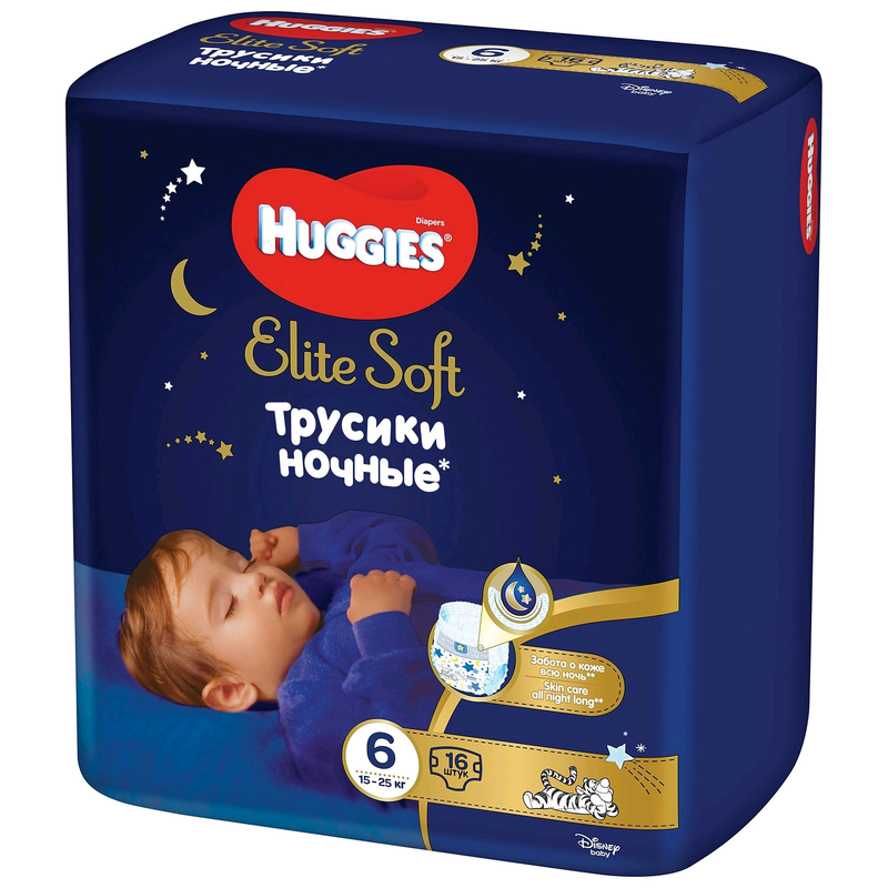Huggies Элит Софт ночные трусики-подгузники 6 ( 15-25 кг) 16 шт Новые ночные трусики' Huggies Elite Soft специально созданы для заботы о коже малыша всю ночь! Благодаря наличию усиленного впитывающего слоя, кожа малыша будет надежно защищена всю ночь, а мягкие и дышащие материалы подгузника обеспечат максимальную заботу о ней –словно мамины объятия. Преимущества: ∙ Усиленный впитывающий слой** для сохранения сухости подгузника всю ночь ∙ Мягкий эластичный 2-зонный цельный поясок для отличной посадки и комфортного сна ∙ Легко надеть – просто натяните трусики ∙ Легко снять – разорвите боковой шов ∙ Липучка для удобной утилизации закрывает запах на замок ∙ Особые материалы позволяют воздуху циркулировать, чтобы кожа малыша оставалась сухой ∙ Индикатор влаги подскажет, когда придет время сменить трусики ∙ Новый ночной дизайн с героем Disney® Подходят для мальчиков и девочек. Huggies Elite Soft. Ваши объятия – наше вдохновение. 'подгузники в форме трусиков ** усиленный впитывающий слой по сравнению с регулярной линейкой трусиков-подгузников Хаггис.