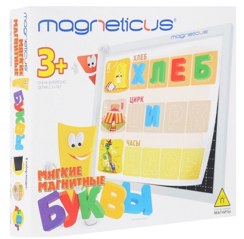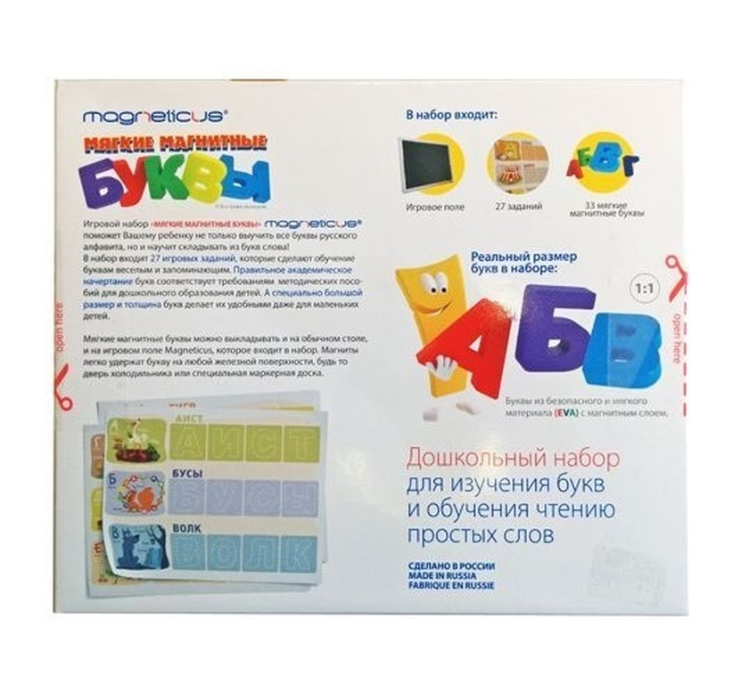 Нет в наличии ОтсутствуетИгровой набор - Мягкие магнитные буквы, Magneticus, ALF-002 Игровой набор «Мягкие магнитные буквы» от компании Magneticus станет отличным помощником родителям в обучении их детей буквам и чтению. Прикрепляя их на любую металлическую поверхность или на магнитную доску в комплекте, ребёнок быстрее запоминает их, опираясь на зрительные образы. В наборе предусмотрены игровые задания, которые помогут малышам научиться составлять и читать слова. Уделяя немного времени для занятий с ребёнком, родители смогут научить их также усидчивости и вниманию, необходимым в школе. Особенности: - Игровой набор включает буквы русского алфавита, магнитное поле и игровые задания для более продуктивного обучения детей. - Объёмные буквы выполнены из качественного материала, имеют размер удобный для детской руки. - Прикрепляя разноцветные буквы на магнитную доску, холодильник или другую металлическую поверхность дети быстро запомнят их. - Для закрепления полученных знаний в комплекте находятся игровые задания, выполняя которые дети научатся складывать из букв слова и читать их. - Играя с набором, дошкольники приобретут необходимые навыки и знания, научатся вниманию и усидчивости, потренируют память. - Все элементы набора имеют яркие цвета, используемые красители не токсичны и гипоаллергенны. - Изделие выполнено из качественных материалов, имеет требуемую сертификацию детских игрушек. Характеристики: Комплект: магнитное поле для сборки, 27 игровых заданий, 33 буквы. Возраст: от 3 лет. Состав: картон, металл, полимеры. Размер поля для сборки: 25 х 21 х 1,5 см. Размер упаковки: 25,5 x 3,5 x 21,5 см Упаковка: картонная коробка. Бренд: Magneticus. Страна обладатель бренда: Россия.