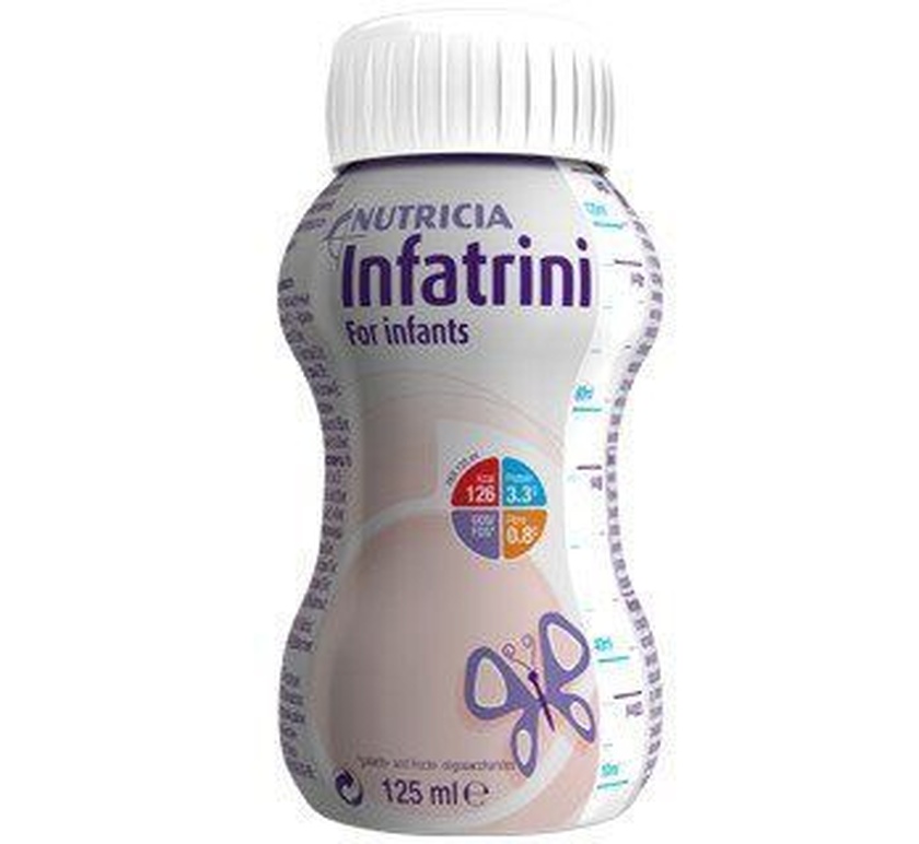 Нет в наличии ОтсутствуетИнфатрини - Смесь для вскармливания малышей от рождения до 18 месяцев (весом до 8 кг). Содержит в себе больше белка, минералов и витаминов для устранения дефицита роста и веса у детей первого года жизни. Специализированная смесь Инфатрини разработана специально для детей, плохо набирающих вес, недоношенных, незрелых, имеющих сопутствующие патологии (порок сердца, поражение ЦНС), перенесших заболевание, инфекцию, операцию и поэтому нуждаются в дополнительном количестве питательных веществ.Смесь жидкая по консистенции, упакована в асептических условиях и полностью готова к использованию. По составу максимально приближена к грудному молоку. Условия храненияХранить в сухом, недоступном для детей месте при температуре +5 - +25°С.Вскрытую бутылочку с неиспользованной смесью можно хранить:•в холодильнике (0 - +4°С), использовать в течение 12 часов, но не более;•при комнатной температуре (+20 - +25°С), использовать в течение 4 часов. Фармацевтическое действие •Быстрый компенсаторный рост малыша (высокое содержание энергии и белка, комплекс витаминов и минералов).•Нормализация микрофлоры кишечника, хороший иммунитет и защита от инфекций (смесь пищевых волокон - пребиотиков GOS/FOS).•Правильное развитие центральной нервной системы (полиненасыщенные жирные кислоты омега-3 и омега-6).*GOS - короткоцепочечные галактоолигосахариды*FOS - длинноцепочечные фруктоолигосахариды. Противопоказания •Гиперчувствительность и/или аллергия к белкам коровьего молока;•Непереносимость лактозы;•Галактоземия;•Состояния, при которых энтеральное питание (повреждение стенки ЖКТ, кишечная непроходимость, тяжелый абдоминальный сепсис) невозможно. Особые указания •Применять только с учетом возрастных потребностей ребенка в энергии, нутриентах и жидкости с учетом переносимости продукта, а также степени зрелости пищеварительной и выделительной систем, сопутствующих патологиях и характера предшествующего вскармливания.•Применять только под наблюдением врача! Состав В состав смеси входят комплекс растворимых пищевых волокон (GOS/FOS*), каротиноиды, эссенциальные ненасыщенные жирные кислоты (омега-3 и омега-6), оптимально сбалансированный состав всех необходимых витаминов и минералов; высокое содержание энергии и белка. Не содержит глютен, холестерин, ГМО. Необходимое количество смеси Инфатрини должно быть рассчитано лечащим врачом или диетологом и зависит от индивидуальных потребностей ребенка в питательных веществах и энергии. Создано программой AVS Document Converter www.avs4you.com