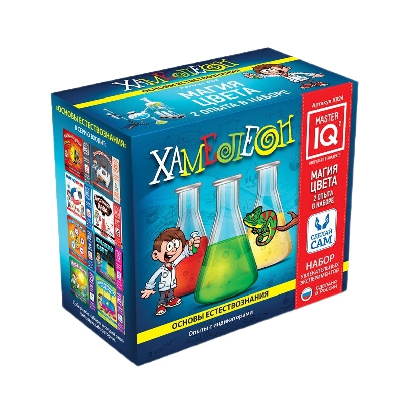 Химия ещё больше интересна с набором "Хамелеон"! Юный химик узнает о веществах-индикаторах, наблюдая как раствор меняет цвет на глазах, переливаясь красным, жёлтым и зелёным. А в дополнительном опыте малиновый раствор невероятным образом становится прозрачным и наоборот. Удивительные опыты с индикаторами! Предлагаем создать жидкость, меняющую цвет!