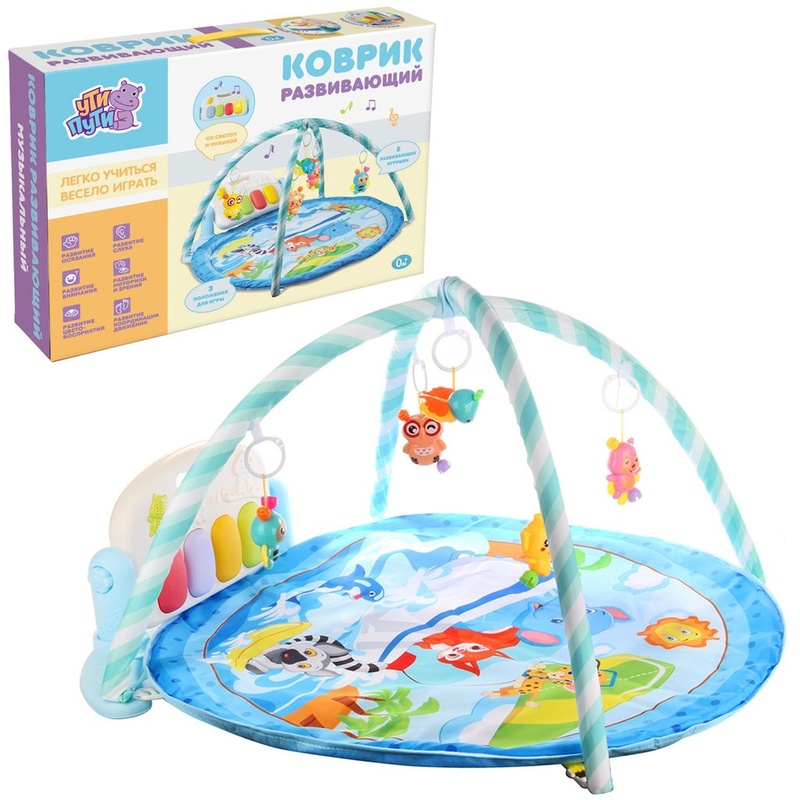 Невероятно полезный для развития малыша яркий и красивый игровой коврик подарит ребенку немало увлекательных часов игры и массу позитивных эмоций. С этим развивающим ковриком малыш будет учиться переворачиваться, сидеть, станет с интересом исследовать окружающий мир. В комплект входят детали для сборки игрового коврика и фигурки-подвески. У коврика мягкая подкладка. Конструкция с ковриком легко собирается и разбирается, занимает мало места в сложенном виде. Возможны 3 положения пианино: - горизонтальное (ребенок сидит и играет ручками); - вертикальное (ребенок играет, нажимая ножками на клавиши. Клавиши большие, удобно нажимать); - под наклоном. Фигурки-подвески снимаются, у бабочки мягкие крылышки-прорезыватели и усики, у бельчонка мягкие элементы под лапками и хвостик, у пчелки мягкие крылышки-прорезыватели. Есть крутящиеся элементы. Фигурки шумят, если их потрясти, выполнены в яркой и красивой расцветке. Пианино работает от батареек. У пианино несколько режимов работы, которые можно переключать с помощью кнопки в виде котика: - режим звуков. Нажимаем на клавишу, она издает звук детского смеха, клавиша подсвечивается; - режим ритм-секции. При нажатии на клавишу издает звуки ударных, кнопки подсвечиваются; - режим ноты. Нажимаем на клавишу, она издает звук ноты и подсвечивается; - режим мелодий. При нажатии на клавиши пианино проигрывает мелодии (более 20 мелодий), кнопки подсвечиваются. Повторное нажатие на клавишу - проигрывание следующей мелодии; - режим звуков зверюшек, при нажатии на клавиши воспроизводит звуки, которые издают зверюшки (собачка, обезьянка, коровка, козочка). Клавиша подсвечивается; - при нажатии на кнопку в виде котика пианино издает разнообразные звуки, проигрывает мелодии, кнопки подсвечиваются. Благодаря такому коврику ребенок будет с удовольствием развивать зрительное и слуховое восприятие, мелкую и крупную моторику, координацию движений, хватательный рефлекс, станет тренировать концентрацию внимания, познакомится с цветами и формами. Набор станет хорошим подарком, который обязательно оценит каждый малыш. Набор предназначен для детей до 3 лет. Пианино работает от 3 батареек АА, не входят в комплект. Набор изготовлен из высококачественных и безопасных полимерных и текстильных материалов. Размеры коврика в собранном виде: 83*83*54 см. Размеры фигурки в виде пчелки: 8*4,5*9 см. Размеры коробки: 53*9*38 см.