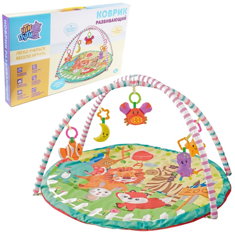 Нет в наличии ОтсутствуетНевероятно полезный для развития малыша яркий и красивый коврик подарит ребенку немало увлекательных часов игры и позитивные эмоции. В комплект входят коврик, 2 дуги, на которые подвешиваются игрушки, фигурные крепления, 5 игрушек-подвесок. Коврик легко собирается и разбирается, есть три разных варианта положения для игры. Игрушки-подвески сделаны из текстильных материалов. Благодаря игрушке ребенок развивает зрительное восприятие, мелкую моторику рук и координацию движений, учится концентрировать внимание, знакомится с цветами и формами. Игрушка изготовлена из гипоаллергенных текстильных материалов, есть элементы полимерных материалов. Размеры игрушки в собранном виде: 90*90*56 см. Размеры коробки: 68*6*40 см.