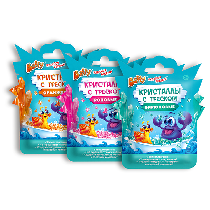 Представляем обновленные кристаллы с треском, предназначенные для игры в ванне. Они окрашивают воду, а также удивительно потрескивают при взаимодействии с водой. Не окрашивают кожу и ванну. Просто добавьте кристаллы в воду и наблюдайте за трещащим цветным представлением! Основой кристаллов является смесь сахарозы и углекислого газа, сочетание которых и дает такой необычный эффект. Кристаллики сахара удерживают газовые пузырьки в общей массе и освобождают их только при соприкосновении с влагой. Безопасны для кожи ребенка, содержат натуральные экстракты. Не окрашивают кожу и ванну. Гипоаллергенны.