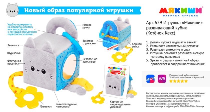 Игрушка-развивающий кубик "Мякиши. Котёнок Кекс", на картонке 15,5*19*10 см.