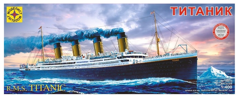 140015 флот Лайнер "Титаник" (1:400) «Титаник» В апреле 1912 года весь мир был потрясен катастрофой пассажирского лайнера «Титаник», затонувшего в Северной Атлантике после столкновения с айсбергом. Прошло почти девяносто лет, но до сих пор эта трагедия волнует миллионы людей. О «Титанике» написаны сотни книг, тысячи статей, поставлены пьесы, снято несколько кинофильмов. История «Титаника» началась в 1909 году, когда судоходная компания «Уайт Стар Лайн» заказала в Белфасте на верфи «Харланд энд Волф» два однотипных лайнера – «Олимпик» и «Титаник». Оба лайнера имели огромное по тем временам (да и по нынешним тоже) водоизмещение и были отделаны с фантастической роскошью – требование компании «Уайт Стар Лайн» гласило, чтобы оба парохода удовлетворяли всем прихотям высшего общества. И действительно, на обоих лайнерах помимо кают всех классов имелись «люксы», часовни, обеденные салоны, плавательный бассейн, бары, танцевальные, гимнастические, читальные залы, почтовое отделение… Обеденный салон для пассажиров первого класса охватывал по высоте три палубы, а два «суперлюкса» включали гостиную, гардеробную, спальню, ванную комнату и отдельную 15-метровую прогулочную палубу с садом. Проезд в один конец в таком «суперлюксе» стоил 4350 долларов (более 50000 долларов по современному курсу). Были на «Титанике» и госпиталь с операционной, и теннисный корт, и даже трюм-гараж для автомобилей пассажиров. Спущенный на воду в Белфасте 31 мая 1911 года, «Титаник» считался самым большим судном в мире. Его водоизмещение составляло 66 тысяч тонн, регистровая вместимость – 46 328 тонн, длина –268 м, ширина – 28,2 м, осадка – 10,54 м. Он имел 11 палуб, соединенных между собой девятью электрическими лифтами. Высота от воды до шлюпочной палубы равнялась 18,5 м, а от киля до верха дымовых труб – 54 м. Диаметр дымовых труб составлял 7,3 м. Трехвинтовой лайнер был оснащен двумя четырехцилиндровыми паровыми машинами тройного расширения, работающими на наружные гребные винты, и паровой турбиной низкого давления конструкции Парсонса, приводящей в движение средний винт. Максимальная мощность силовой установки составляла 55 тысяч л.с., что позволяло лайнеру развивать скорость до 25 узлов (около 46 км/ч). Что же касается непотопляемости «Титаника» и обеспечения безопасности пассажиров, то лайнер вполне удовлетворял всем тогдашним нормам. «Титаник» имел двойное дно и был разделен на 16 отсеков. Пароход должен был удержаться на плаву при затоплении любых двух отсеков. Он мог сохранить плавучесть при затоплении любых трех из первых пяти отсеков – и даже при затоплении первых четырех носовых отсеков. Но айсберг распорол борт «Титаника» на длине около 100 м, чего конструкторы предусмотреть не могли. 11 апреля 1912 года, в 14.00, «Титаник» начал свое роковое плавание, имея на борту 1316 пассажиров (а всего он мог принять до 3 500 пассажиров) и 891 члена экипажа (из которых 500 являлись обслугой – стюардами, поварами, горничными и.т.д.) В ночь с 14 на 15 апреля, на четвертый день плавания, при абсолютно спокойном море, «Титаник» столкнулся с айсбергом. Обшивка парохода на треть длины корпуса была распорота, как консервная банка. Команда судна сделала все возможное для спасения пассажиров. Механики и кочегары прилагали отчаянные усилия, чтобы поддержать давление пара в работающих котлах, необходимое для работы насосо