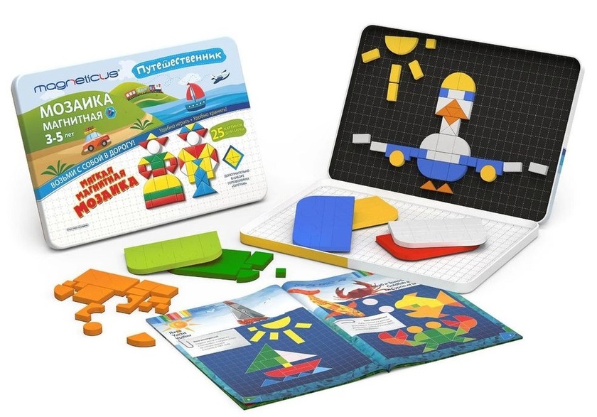 Магнитная мозаика – Путешественник, 245 элементов в металлической коробке, Magneticus, MMT-245 Возьмите магнитную мозаику от российской компании «Magneticus» с собой в дорогу и Ваш путешественник будет коротать время в дороге, увлеченно собирая разнообразные картинки. Детали имеют более крупный размер, чем в обычной мозаике, прекрасно держатся на крышке жестяной упаковки, которая послужит игровым полем. Особенности: - Внутри красочно оформленной жестяной коробки находится 245 магнитных элементов 7 цветов, выполненных в 7 геометрических формах. - Элементы мягкие и приятные на ощупь, выполнены из современного вспененного материала ЭВА. - В комплекте находится подробная красочная инструкция с 20 примерами картинок, которые ребенок сможет собрать самостоятельно. - Благодаря компактной упаковке, в которой можно хранить все элементы, мозаику можно взять с собой в путешествие, чтобы развлечь ребенка. - Выкладывать картинки из магнитных деталей можно на любой металлической поверхности, прекрасно для этой цели послужит жестяная упаковка. - Играть с мозаикой можно в поезде, автобусе или в машине во время пути, фигурки надежно фиксируются на поверхности игрового поля, узор не испортится во время тряски. - Внутри коробка черного и белого цвета, что позволит ребенку выбрать подходящий фон для будущей картинки. - Занимаясь с мозаикой, ребенок познакомится с геометрическими формами, основными цветами, сформирует понимание разницы между частью и целым, потренирует пространственное мышление. - Ребенок научится работать по образцу, развивая визуальную память и внимание, а затем сможет придумать свои композиции, расширяя границы игры и простор для творчества. - В качестве презента для малышей предлагается магнитная головоломка «Танграм». Характеристики: Комплект: 245 мягких магнитных элементов из ЭВА, буклет с примерами сборки картинок, металлическая коробка. Возраст: от 3 лет до 5 лет. Состав: полимерные материалы, ЭВА, бумага, металл. Вес упаковки: 0.25 кг. Размер упаковки: 2,5 x 19 х 28 см. Страна производитель: Россия. Упаковка: жестяная коробка-планшет. Производитель: Magneticus. Страна обладатель бренда: Россия.