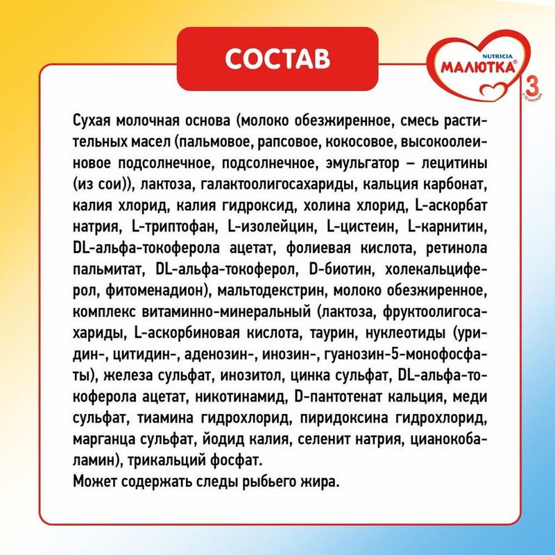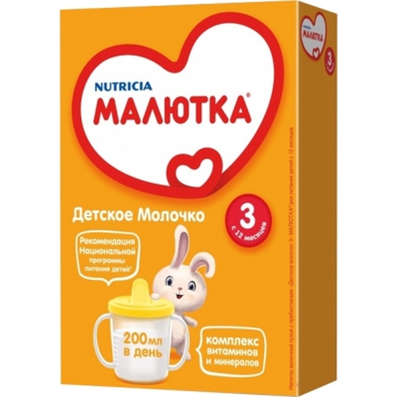 Нет в наличии ОтсутствуетДетское молочко Малютка 3 с 12 мес. 300 г. Напиток молочный сухой с пребиотиками «Детское молочко 3» Малютка для питания детей с 12 месяцев. Когда малышу исполняется год, он продолжает активно расти и развиваться, и, по сравнению со взрослым, у него повышенные потребности в витаминах и минералах. Из обычной еды малыш не получает их в достаточном количестве. Дополнить рацион ребенка необходимыми ему питательными веществами поможет детское молочко Малютка. Согласно Национальной программе оптимизации питания детей от 1 года до 3 лет, ежедневный молочный рацион ребенка должен состоять из 400-450 мл молочных продуктов, включая 200 мл детских молочных напитков 3 или 4 ступени. Из 200 мл детского молочного напитка ребенок получит (по сравнению с коровьим молоком): в 5 раз больше железа, в 2 раза больше витамина А, больше витамина D. Особенности: Рекомендация Национальной программы питания детей 200 мл в день. Комплекс витаминов и минералов. Пребиотики ГОС/ФОС. Без сахара. Без красителей, консервантов, искусственных добавок и ГМО. Условия хранения: продукт хранят при температуре от 0°С до 25°С и относительной влажности не более 75%. После вскрытия пакета хранить продукт в сухом прохладном месте, но не в холодильнике, плотно закрытым, не более 3 недель. Полный состав продукта: молоко обезжиренное, смесь растительных масел (пальмовое, рапсовое, кокосовое, подсолнечное), мальтодекстрин, лактоза, пребиотики (галактоолигосахара, фруктоолигосахара), минеральные вещества, витаминный комплекс, холин, таурин, эмульгатор соевый лецитин, микроэлементы, L-триптофан, инозитол, L-изолейцин, нуклеотиды, L-цистеин, L-карнитин. Может содержать следы рыбьего жира. Важно! Для питания детей раннего возраста предпочтительнее грудное вскармливание. Перед применением продукта проконсультируйтесь со специалистом. Несоблюдение инструкций по приготовлению и хранению напитка может нанести вред здоровью ребенка. Не допускается назначать детям, имеющим аллергию на любой компонент, входящий в состав продукта. Никогда не оставляйте Вашего ребенка одного во время кормления. Для детского питания. Внимание! Готовьте питание непосредственно перед употреблением! Не используйте остатки питания для последующего кормления. Не подогревайте напиток в СВЧ-печи, во избежание образования горячих комочков в продукте. Никогда не добавляйте лишнего порошка или что бы то ни было в приготовленный напиток. Общие характеристики Возраст от 1 года до 1 года 6 месяцев Вес 600 грамм Страна производитель Россия Торговая марка Малютка Срок годности от даты изготовления18 месяцев