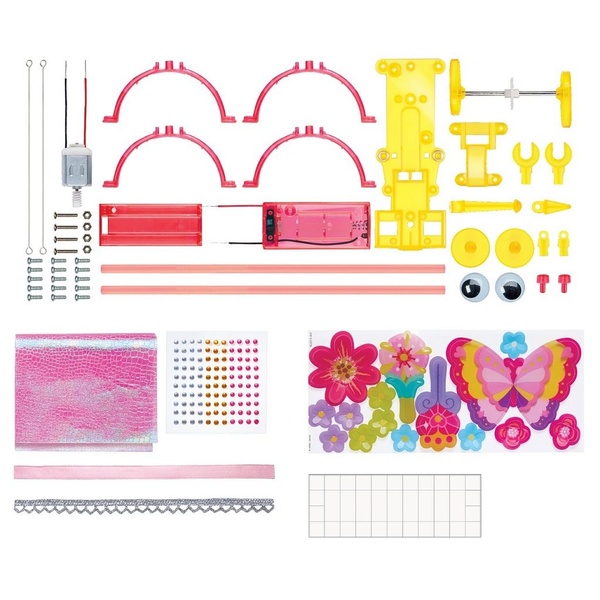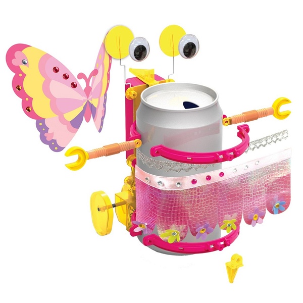 Превратите использованную жестяную банку в робота-девочку, нарядите ее с помощью аксессуаров и устройте модное дефиле! Не нужно быть волшебником, чтобы оживлять предметы, просто соберите набор «Мисс Банкабот». В комплекте: - 4 кольца для тела - Корпус - 4 болта и гайки - Винты - Короткая нога - 2 соломинки - 2 клеммные крышки - 2 рука-манипуляторы - Игрушечный мотор с редуктором - 2 глазные пластины - Металлическая проволока - 2 движущихся глаза - Ось с редуктором - Крышка двигателя/оси - Лоскут розовой ткани - Наклейки в виде камней - Двусторонняя клейкая лента - Кружево - Лента - Лист с наклейками Также потребуются (не входят в набор): маленькая крестовая отвертка, батарейка типа АА, чистая пустая жестяная банка. Как это работает? Батарейка подает мотору электричество, мотор с большой скоростью крутит червячную передачу. Она выполняет роль редуктора: поворачивает шестерню с более низкой скоростью. Шайбы на концах оси — это просто круги с выступами. Когда шайба вращается, выступ крутится. Когда мотор работает, шайбы заставляют стороны робота подниматься по очереди, и он шагает. Меры предосторожности. Набор предназначен для детей старше 8 лет. Перед началом сборки внимательно прочтите инструкцию. Помните, что при работе с конструктором требуется контроль взрослых. Игрушка предусматривает наличие мелких деталей, поэтому не рекомендуется детям младше 3 лет. Используйте под наблюдением взрослых. Чтобы избежать короткого замыкания, не касайтесь контактов в батарейном отсеке металлическими предметами.