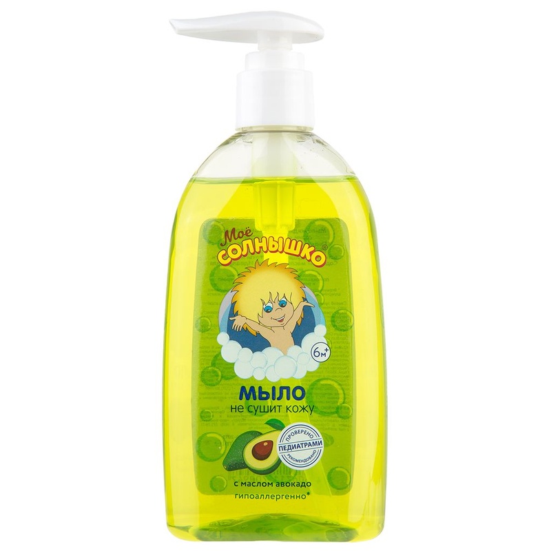 Мое солнышко Мыло жидкое с маслом авокадо предназначено для деликатного, мягкого очищения и ухода за чувствительной и нежной кожей ребенка. Особенности: Жидкое мыло бережно и мягко очищает нежную кожу малыша и эффективно препятствует ее шелушению. Оно не создаст дискомфорта при его попадании в глаза и отлично подходит для умывания. Благодаря содержанию в нем масла авокадо и увлажняющих добавок оно смягчает, увлажняет и питает детскую кожу, предотвращает ее раздражение и чрезмерное высушивание. У флакона есть удобный дозатор, обеспечивающий удобное и комфортное применение. Масло авокадо смягчает, питает и увлажняет детскую кожу, предотвращает чрезмерное высушивание и раздражение кожи. Жидкое мыло мягко и бережно очищает нежную и чувствительную кожу ребенка и препятствует её шелушению. Не создает дискомфрта при попадании в глаза и хорошо подходит для умывания. Клинически проверено и рекомендовано ФГУ «МНИИ Педиатрии и детской хирургии Минздрава России».