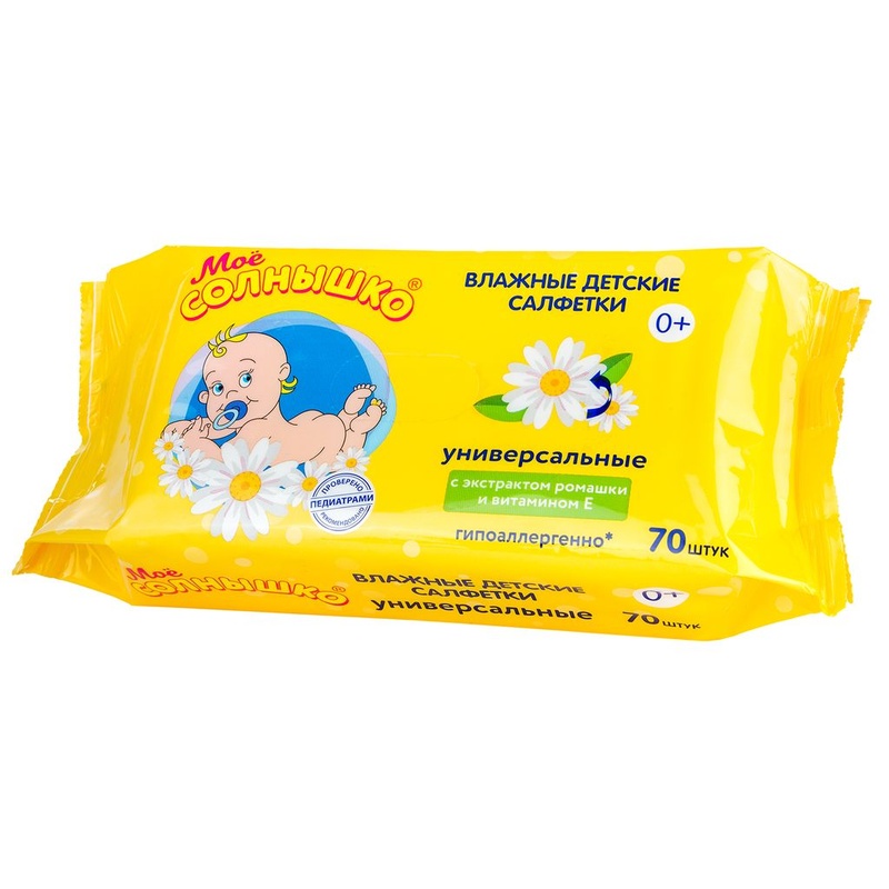 Мое солнышко Салфетки влажные для детей универсальные разработаны для нежного очищения кожи малыша и одновременного эффективного ухода. Особенности: Делают ежедневную гигиену в любых условиях значительно комфортнее. Незаменимы дома, при смене подгузника, на прогулке, в поликлинике и в гостях. Легко и бережно удаляют загрязнения. Мягкая pH формула не сушит кожу. Не содержат спирта и мыла. Подходят для чувствительной кожи. Клинически проверено и рекомендовано ФГУ «МНИИ Педиатрии и детской хирургии Минздрава России». Экстракт ромашки и витамин Е защищают от воспаления и успокаивают кожу; Ионы серебра оказывают мягкое антибактериальное действие, сохраняя естественную защиту кожи. Способ применения: Откройте клапан, достаньте необходимое количество салфеток, нежно протрите кожу малыша. Во избежание высыхания салфеток плотно закрывайте клапан.