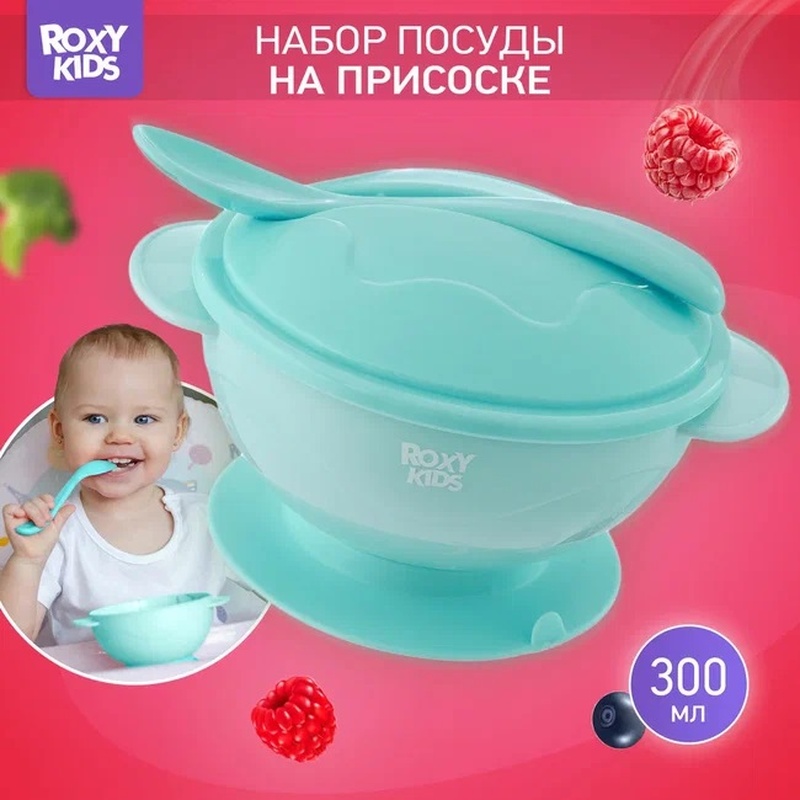 Набор для кормления: тарелка на присоске, крышка и ложка, голубой