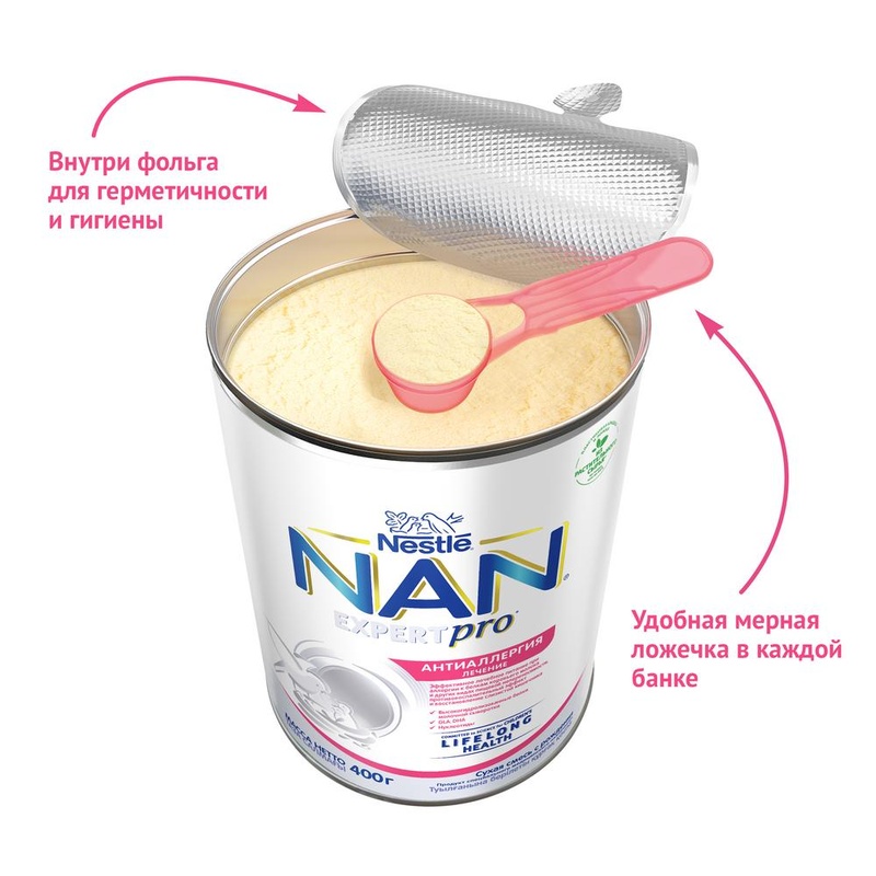 Смесь NAN® EXPERTPRO Антиаллергия – лечебная смесь на основе гидролизата белка молочной сыворотки, обеспечивающая эффективное облегчение симптомов аллергии к белкам коровьего молока (АБКМ) у детей, в том числе, с нарушением функций желудочно-кишечного тракта (ЖКТ) или пищевой непереносимостью неясной этиологии. Белковый компонент NAN® EXPERTPRO Антиаллергия представлен высокогидролизованными белками молочной сыворотки. Белки молочной сыворотки отличаются адекватным содержанием незаменимых аминокислот, необходимых для полноценного роста и развития ребенка. Противовоспалительный эффект GLA и DHA вносит существенный вклад в эффективность диетотерапии. Нуклеотиды помогают восстанавливать поврежденную слизистую оболочку кишечника. Среднецепочечные триглицериды быстро и легко всасываются, являясь легкодоступным источником энергии для ребенка. NAN® EXPERTPRO Антиаллергия может использоваться под наблюдением врача в качестве основного источника питания в течение первого года жизни ребёнка, при условии своевременного введения прикорма. Противопоказания: не применять при галактоземии или глюкозо-галактозной мальабсорбции. Для питания детей раннего возраста предпочтительнее грудное вскармливание. Идеальной пищей для грудного ребёнка является молоко матери. Перед тем, как принять решение об искусственном вскармливании с использованием детской смеси, обратитесь за советом к медицинскому работнику. Меры предосторожности: Не для внутривенного применения. Использовать только под наблюдением специалиста. Использование некипяченой воды и непрокипяченых бутылочек, а также неправильное хранение, транспортировка, приготовление и кормление могут привести к неблагоприятным последствиям для здоровья ребенка. Когда ребенок подрастет, переходите на кормление из чашки. Рекомендации по приготовлению/использованию: Порцию смеси следует готовить непосредственно перед кормлением. Точно следуйте инструкции по приготовлению. Оставшаяся после кормления разведенная смесь не подлежит хранению и последующему использованию. Во время кормления необходимо поддерживать ребенка, чтобы он не поперхнулся. Состав товара: Мальтодекстрин, ферментативно гидролизированный белок молочной сыворотки, растительные масла (пальмовый олеин, подсолнечное масло, низкоэруковое рапсовое масло, масло семян черной смородины), среднецепочечные триглицериды, картофельный крахмал, минеральные соли (кальция глицерофосфат, магния хлорид, натрия хлорид, калия фосфат (калиевая соль ортофосфорной кислоты), калия хлорид, кальция фосфат (кальциевая соль ортофосфорной кислоты), железа сульфат, цинка сульфат, меди сульфат, калия йодид, кальция хлорид, марганца сульфат), эмульгатор (Е472с), витамины (С (аскорбат натрия), Е (D-альфа-токоферола ацетат), ниацин, пантотеновая кислота, В2 (рибофлавин), А (ретинола ацетат), В6 (пиридоксина гидрохлорид), B1 (тиамина мононитрат), D3 (холекальциферол), К1 (филлохинон), фолиевая кислота, В12 (цианкобаламин), биотин), рыбий жир, таурин, холин битартрат, инозит, нуклеотиды (цитидинмонофосфат, уридинмонофосфат, аденозинмонофосфат, гуанозинмонофосфат), L-карнитин.