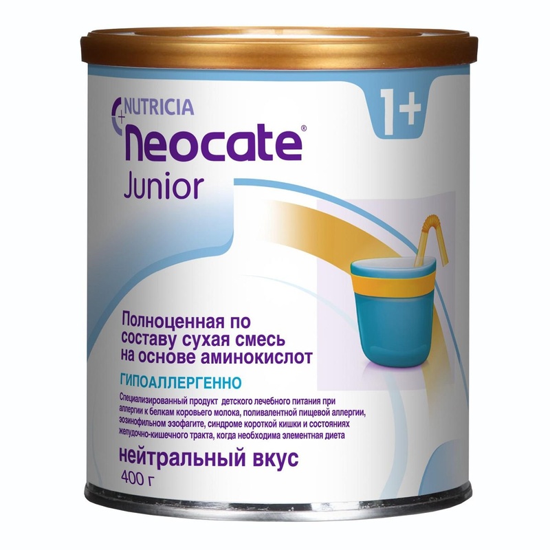 Неокейт Джуниор (Neocate Junior) - специализированный продукт детского диетического лечебного питания для детей старше 1 года, аналогично продукту Неокейт Эдванс (Neocate Advance) - это полноценная сухая смесь на основе аминокислот. Продукт предназначен для диетического лечебного питания детей от 1 года до 10 лет при аллергии к белкам коровьего молока, поливалентной пищевой аллергии, синдроме мальабсорбции, и других состояниях желудочно-кишечного тракта, когда необходима элементная диета. Продукт может быть использован в качестве основного питания или в качестве дополнения к основной диете ребенка. Неокейт Джуниор (Neocate Junior) может являться единственным или дополнительным источником питания к основной диете ребенка. Cмесь Неокейт Джуниор может служить источником белка, жира, углеводов, витаминов, минеральных веществ и энергии для диетического лечебного питания детей от 1 года до 10 лет при аллергии к белкам коровьего молока, поливалентной пищевой аллергии, эозинофильном эзофагите, синдроме короткой кишки, мальабсорбции и других состояниях желудочно-кишечного тракта, когда необходима элементная диета, в качестве основного питания и в качестве дополнения к основной диете ребенка. В соответствии со статьей 4 ТР ТС 027/2012 «О безопасности отдельных видов специализированной пищевой продукции, в том числе диетического лечебного и диетического профилактического питания», продукт относится к «специализированной пищевой продукции с заданной пищевой и энергетической ценностью, физическими и органолептическими свойствами, и предназначенной для использования в составе лечебных диет». ПОКАЗАНИЯ К ПРИМЕНЕНИЮ Neocate Junior (Неокейт Джуниор) разработан не только как продукт диетотерапии, но и как диагностический продукт для детей в возрасте от 1 до 10 лет в следующих ситуациях: Аллергия к белкам коровьего молока Поливалентная пищевая аллергия Эозинофильный эзофагит Синдром короткой кишки Мальабсорбция и другие состояния ЖКТ, требующие элементную диету ПРОТИВОПОКАЗАНИЯ Состояния, при которых невозможно энтеральное питание (профузное желудочно-кишечное кровотечение, перфорация желудочно-кишечного тракта, кишечная непроходимость, тяжелый абдоминальный сепсис). Состав: сухой сироп глюкозы, рафинированные растительные масла (среднецепочечные триглицериды (пальмоядровое и/или кокосовое масло), высокоолеиновое подсолнечное, рапсовое, подсолнечное), L-серин, L-глютамин, мальтодекстрин, глицин, L-аланин, L-лейцин, L-лизана ацетат, L-треонин, трикалия цитрат, L-тирозин, эмульгатор (Е472с), L-валин, L-изолейцин, кальция фосфат двухосновный, хлорид магния, L-пролин, динатрия гидрофосфат, кальция карбонат, L-цистин, L-гистидин, L-фенилаланин, дикалия гидрофосфат, L-метионин, L-аргинин, натрия хлорид, холина битартрат, L-триптофан, кальция цитрат, L-аскорбиновая кислота, хлорид кальция, антиокислители (лицетин из подсолнечника, аскорбилпальмитат), таурин, миоинозитоп, железа сульфат, L-карнитин, цинка сульфат, DL-a-токоферола ацетат, никотинамид, кальция D-пантотенат, меди сульфат, рибофлавин, марганца сульфат, гидрохлорид тиамина, гидрохлорид пиридоксина, витамина А ацетат, йодид калия, фолиевая кислота, молибдат натрия, хлорид хрома, селенит натрия, фитоменадион, D-бмотин, холекальциферол, цианокобаламин. ПРЕДУПРЕЖДЕНИЯ Аминокислотная детская смесь Neocate Junior (Неокейт Джунио