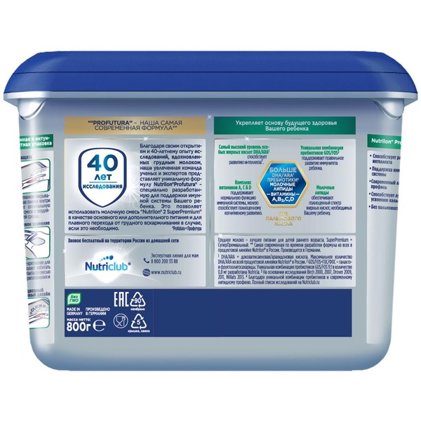 Смесь Nutrilon Super Premium 2 800г с 6 месяцев Формула последнего поколения* “Profutura” – наша самая современная формула* Благодаря своим открытиям и 40 летнему опыту исследований, вдохновленных грудным молоком, наша увлеченная команда ученых и экспертов представляет уникальную формулу Nutrilon Profutura – специально разработанную для поддержки имунной системы вашего ребенка. Это позволяет использовать ее в качестве основного или дополнительного питания и для плавного перехода от грудного вскармливания в случае, если это необходимо. Грудное молоко – лучшее питание для детей раннего возраста. SuperPremium = СуперПремиальный Profutura = Профутура DHA/ARA = докозагексаеновая/арахидоновая кислота. GOS/FOS- галакто- и фруктоолигосахариды *Самая современная по времени разработки формула, из всей в продуктовой линейки Нутрилон в России Максимальное количество ДЦПНЖК из всей продуктовой линейки Нутрилон в России (приложено досье) Уникальная комбинация пребиотиков GOS/FOS 9:1 в количестве 0,8 мг разработан Nutricia. На основании ислледования Birch2000, 2007,Drover2009,2011,Willats 2013 Благодаря уникальной комбинации пребиотиков и современному липидному профилю. Укрепляет основу будущего здоровья вашего ребенка с 6 месяцев Самый высокий уровень особых жирных кислот DHA/ARA1 способствует развитию интеллекта3 Комплекс витаминов A, C & D поддерживает нормальную функцию иммунной системы, железо способствует полноценному когнитивному развитию Больше DHA/ARA1 Пребиотики2 Молочные липиды Витамины A, B2, C, D Без Пальмового масла Уникальная комбинация пребиотиков GOS/FOS поддерживает правильное развитие иммунитета ребенка, Молочные липиды обеспечивают полноценный спектр жирных кислот вашему ребенку. Инновационная и интуитивно понятная упаковка Двойная защита Безопасный механизм закрывания и защитная пленка внутри обеспечивают оптимальную защиту сухой смеси от воздействия внешней среды. Гигиеничное хранение. Специальное крепление для ложки позволяет избегать прямого контакта со смесью в процессе приготовления и хранения Инновационный эргономичный дизайн Условия хранения Невскрытую упаковку хранить при температуре от 0 °С до 25 °С и относительной влажности не более 75%. Вскрытую упаковку храните плотно закрытой в прохладном, сухом месте, но не в холодильнике. Используйте содержимое вскрытой упаковки в течение трех недель. Способствует развитию интеллекта Поддержка иммунной системы Современный липидный профиль Способствует лучшему усвоению кальция4 Без пальмового масла Мерная ложка закреплена на специальном креплении внутри коробки Для питания детей раннего возраста предпочтительнее грудное вскармливание. Перед применением смеси проконсультируйтесь cо специалистом. Несоблюдение инструкций по приготовлению и хранению смеси может нанести вред здоровью ребенка. Никогда не оставляйте Вашего ребенка одного во время кормления. Для детского питания. Не допускается назначать детям, имеющим аллергию на любой компонент, входящий в состав продукта СОСТАВ: Лактоза, деминерализованная молочная сыворотка, обезжиренное молоко, молочный жир, смесь растительных масел (рапсовое, подсолнечное, кокосовое, масло из Mortierellaalpina), пребиотики (галактоолигосахариды, фруктоолигосахариды), концентрат белков молочной сыворотки, фосфолипиды яичного желтка, источники минеральных веществ (кальция карбонат, калия хлор