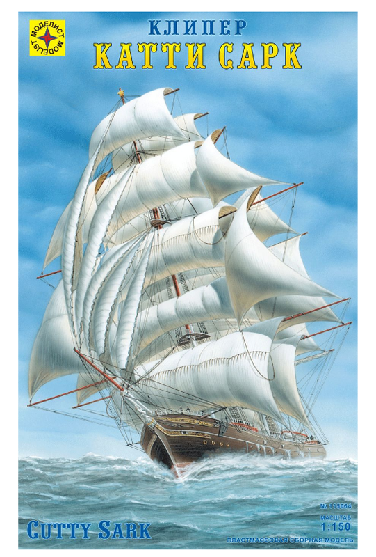 115064 флот Парусник "Катти Сарк" (1:150) Клипер «Катти Сарк» - Англия, 1869 г. У каждой морской державы своя история, свой перечень прославленных кораблей. Но есть названия, которые известны всему миру. Одно из них –«Катти Сарк». Казалось бы странно – судно не открывало новых земель, не сыграло существенную роль в истории как, например, «Санта Мария» или «Боном Ричард». Были парусники и крупнее и быстроходнее. Одно из объяснений популярности «Катти Сарк» в ее активном долголетии. Клипер по-прежнему в строю. Сейчас на нем находится музей парусного флота, открытый королевой Англии 25 июня 1957 г. Клипера были типичными представителями парусников периода романтизма. Созданные в самом конце эпохи парусных кораблей, они отличались заостренными формами корпуса, великолепной остойчивостью, высокой маневренностью и скоростью, благодаря чему их использовали для самых дальних плаваний. Построенные полтора столетия назад, они достигали скорости 18-22 узлов, что вполне соизмеримо со скоростью многих современных кораблей. «Катти Сарк», построенная по заказу известного лондонского судовладельца Джона Уиллиса на верфи «Скотт и Линтон» в Думбартоне на р. Клайд (Шотландия) была спущена на воду 22 ноября 1869 г. Свое экзотическое название парусник получил по имени героини популярной тогда поэмы Роберта Бернса. Корпус был композитной конструкции: набор – остов корпуса – выполнен из стали и обшит досками. Деревянная обшивка подводной части защищена медными листами. В отличие от многих других клиперов самая широкая часть корпуса была несколько смещена к более массивной корме, мачты сделаны чуть ниже, а реи длиннее. На взгляд того, кто больше всего ценил в обводах корабля изящество арабских скакунов, детище Уиллиса походило на ухоженную ломовую лошадь. Но корабль и строился не как прогулочная яхта, а как быстроходный тяжеловоз для перевозки грузов через несколько океанов. Для увеличения грузовместимости под палубой не было даже переборок. Более мощная корма лучше выдерживала волны при самом опасном попутном шторме, а более низкий и широкий рангоут позволял нести в штормовом море больше парусов ( значит, идти с большей скоростью) в отличие от других парусников, вынужденных для безопасности убавлять паруса. С 1870 по 1877 гг. «Катти Сарк» выполнила 8 рейсов в Китай и обратно с грузом чая. Ее владелец ожидал, что его корабль на этом маршруте будет самым быстрым. Однако за первые семь лет «Катти Сарк» ни разу не смогла опередить своего извечного соперника – клипер «Фермопилы» с его более удачливым капитаном Кемболом. Но были и более опасные конкуренты – пароходы, которым требовалось на рейс гораздо меньше времени, поскольку они могли идти через только-что открытый Суэцкий канал. Клиперам же приходилось идти вокруг Африки, мимо мыса Доброй Надежды, недаром ранее называвшегося мысом Бурь. Пароходов становилось все больше и постепенно они вытеснили клиперы с «чайной» линии. Оставалась еще перевозка шерсти из Австралии, где пароходы из-за отсутствия бункеровочных станций конкурировать пока не могли. Здесь «Катти Сарк» не знала равных. Ее официально зарегистрированный в офисе Ллойда рекорд при плавании от Сиднея до Темзы = 67 дней. В 1887 г. «Катти Сарк» на 8 суток обогнала «Фермопилы» и на 18-20 суток средние клипера. Первые два плавания за шерстью совершил капитан Мур, о